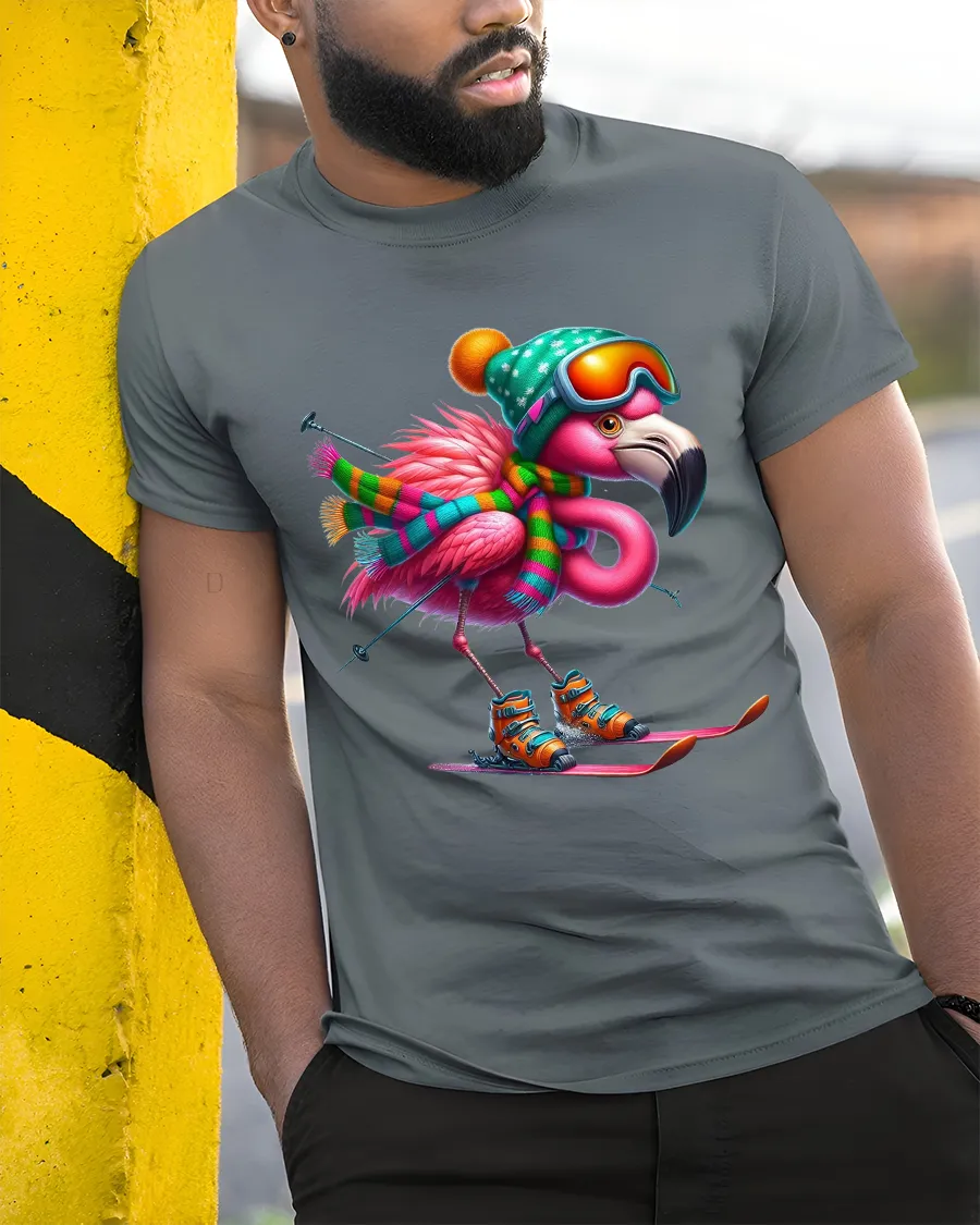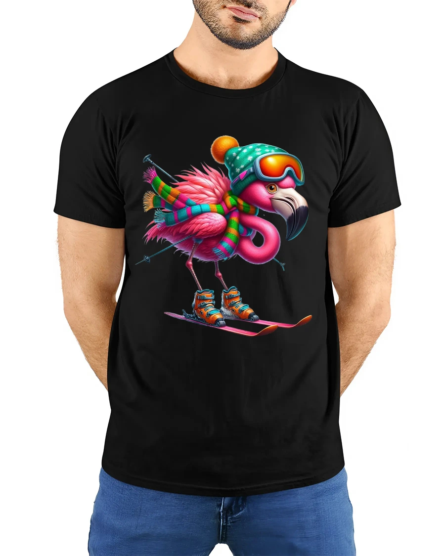 This skiing flamingo t shirt adds personality and cheerful energy to any casual outfit with its bold cartoon style.
