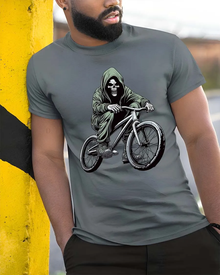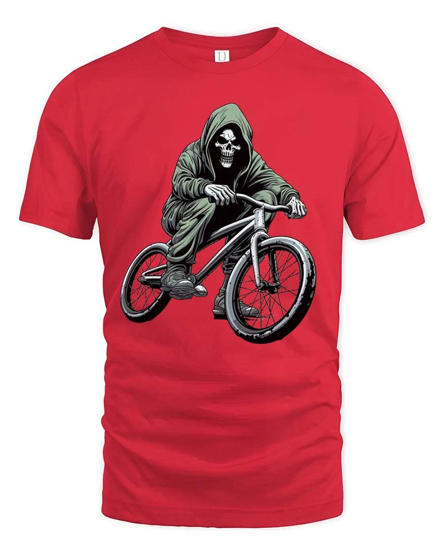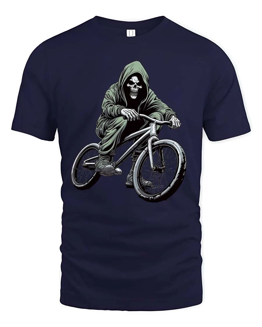 Featuring a hooded skeleton riding a BMX bike, this design blends dark aesthetics with urban energy for a powerful visual impact.