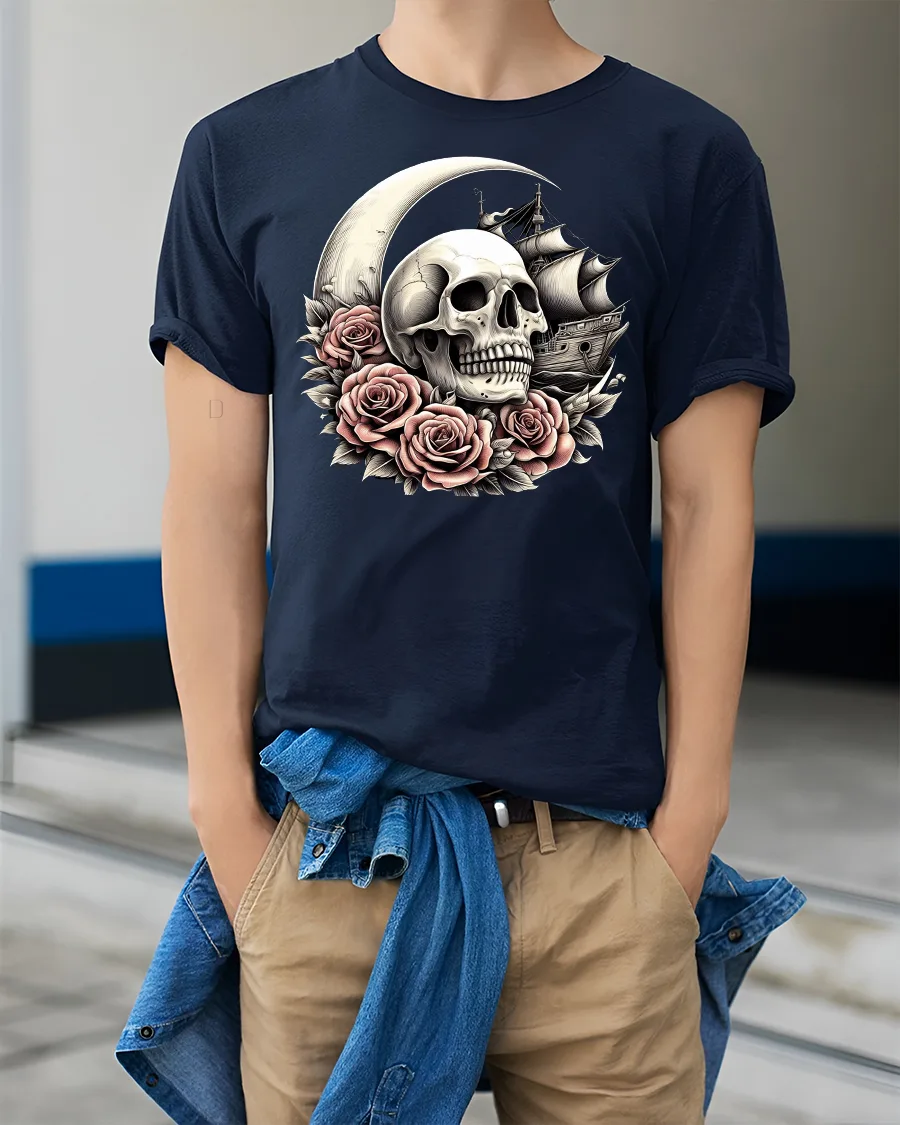 Sail into the dark side of style with the Skull Moon Roses Pirate Ship Gothic Art Graphic T-Shirt. This stunning tee features a detailed skull surrounded by soft roses beneath a crescent moon, with a haunting pirate ship sailing behind. The balance of beauty and darkness creates a design that’s bold, artistic, and unforgettable. Crafted from premium cotton, this shirt combines comfort with high-quality print that keeps its edge wash after wash.