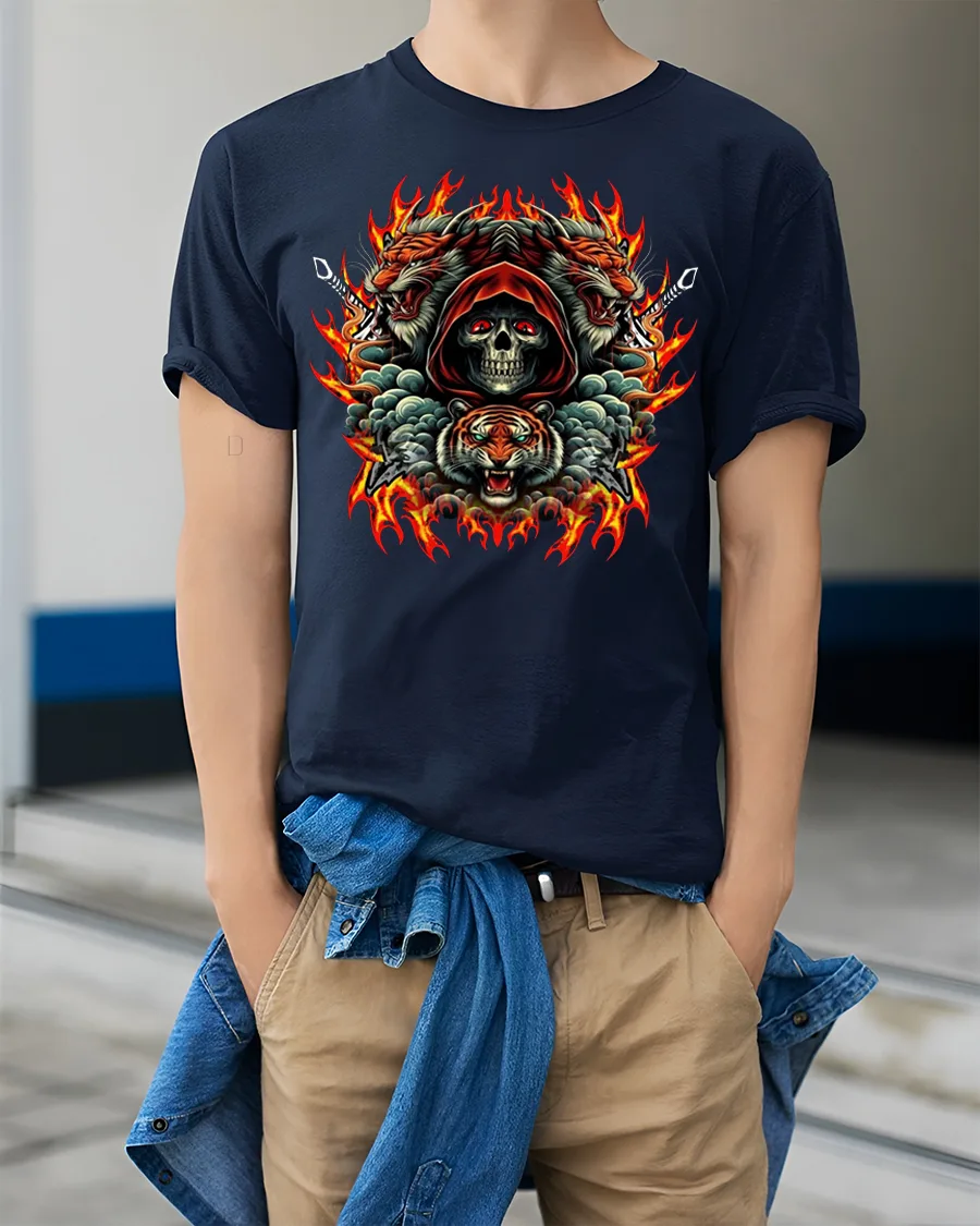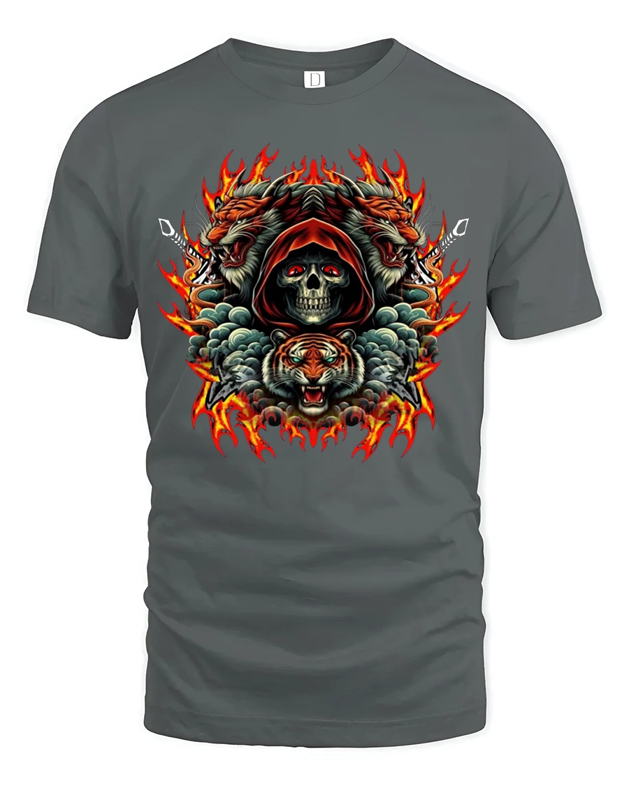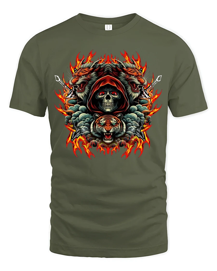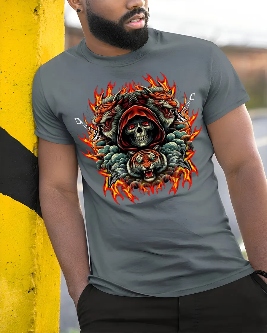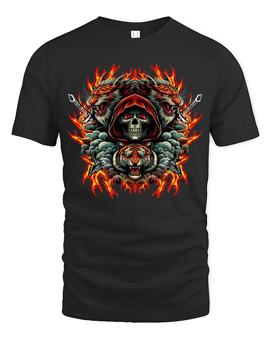 Unleash bold energy with the Skull Tiger Fire Fury Gothic Print Graphic T-Shirt. Featuring a fierce hooded skull framed by roaring tigers and blazing flames, this striking design combines gothic intensity with animal power. The bold colors and detailed artwork make this tee stand out, perfect for those who love fiery gothic art and fearless style.