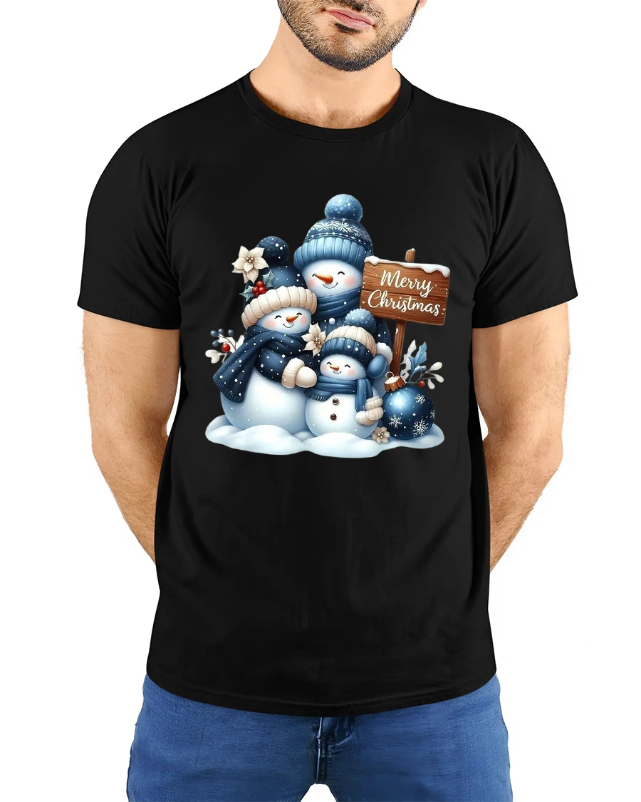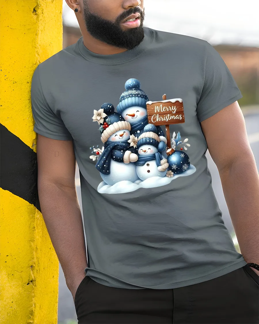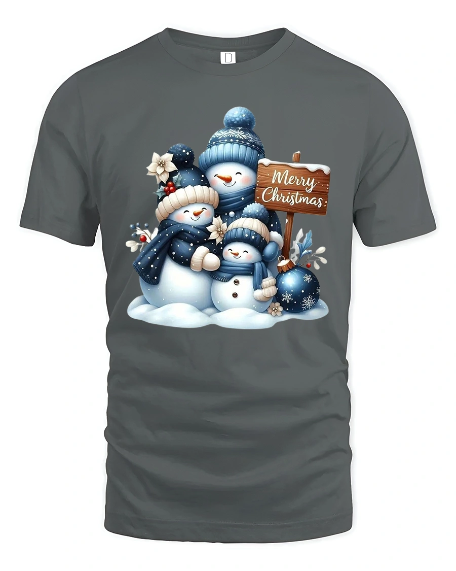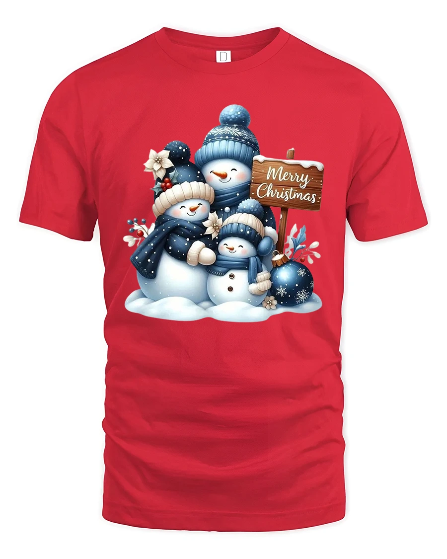 Soft snowy textures and cool winter shades give this tee a soothing seasonal look that stands out beautifully during holiday celebrations. Whether worn to gatherings, Christmas photos, or everyday winter fun, the cheerful snowman family adds a touch of joy and comfort to your outfit. Its cute and uplifting design is perfect for anyone who loves classic holiday imagery wrapped in a sweet, modern style.