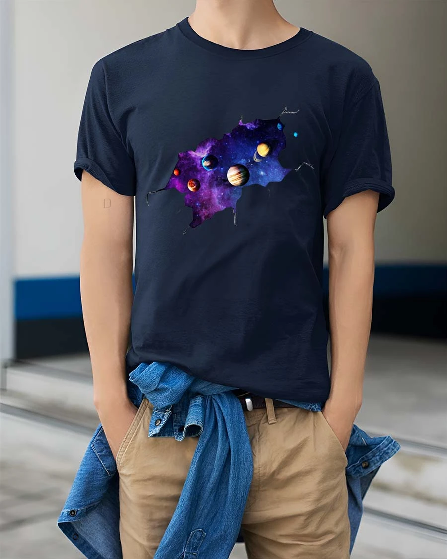 Add a touch of the universe to your wardrobe with this striking galaxy planets graphic t-shirt.