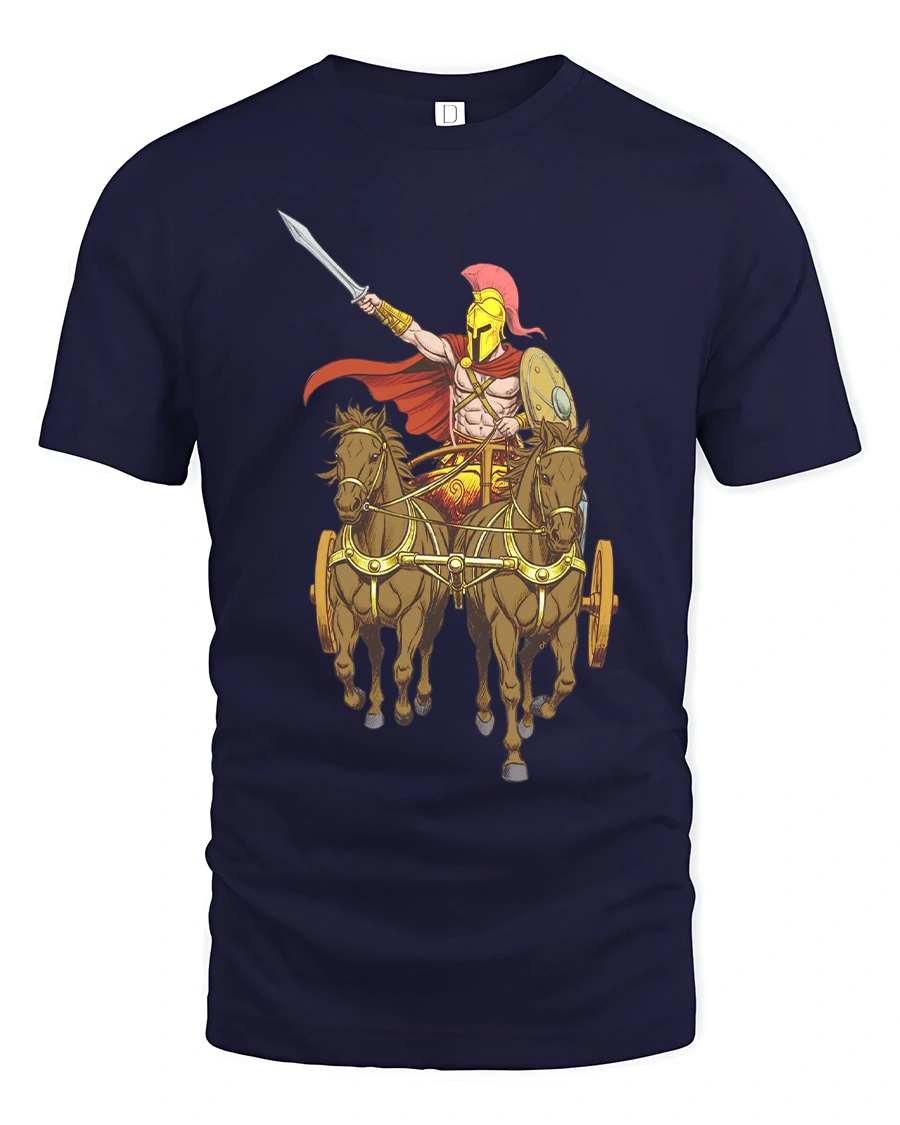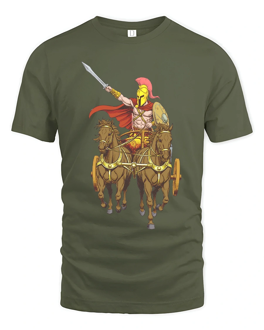 Channel the strength and courage of ancient legends with this Spartan Warrior Chariot T Shirt Epic Ancient Greek Hero Tee. The dynamic artwork showcases a fearless warrior standing tall in a chariot, spear raised high as horses charge into battle. Inspired by classical mythology and heroic tales, this bold graphic captures the spirit of determination, honor, and timeless power in striking detail.