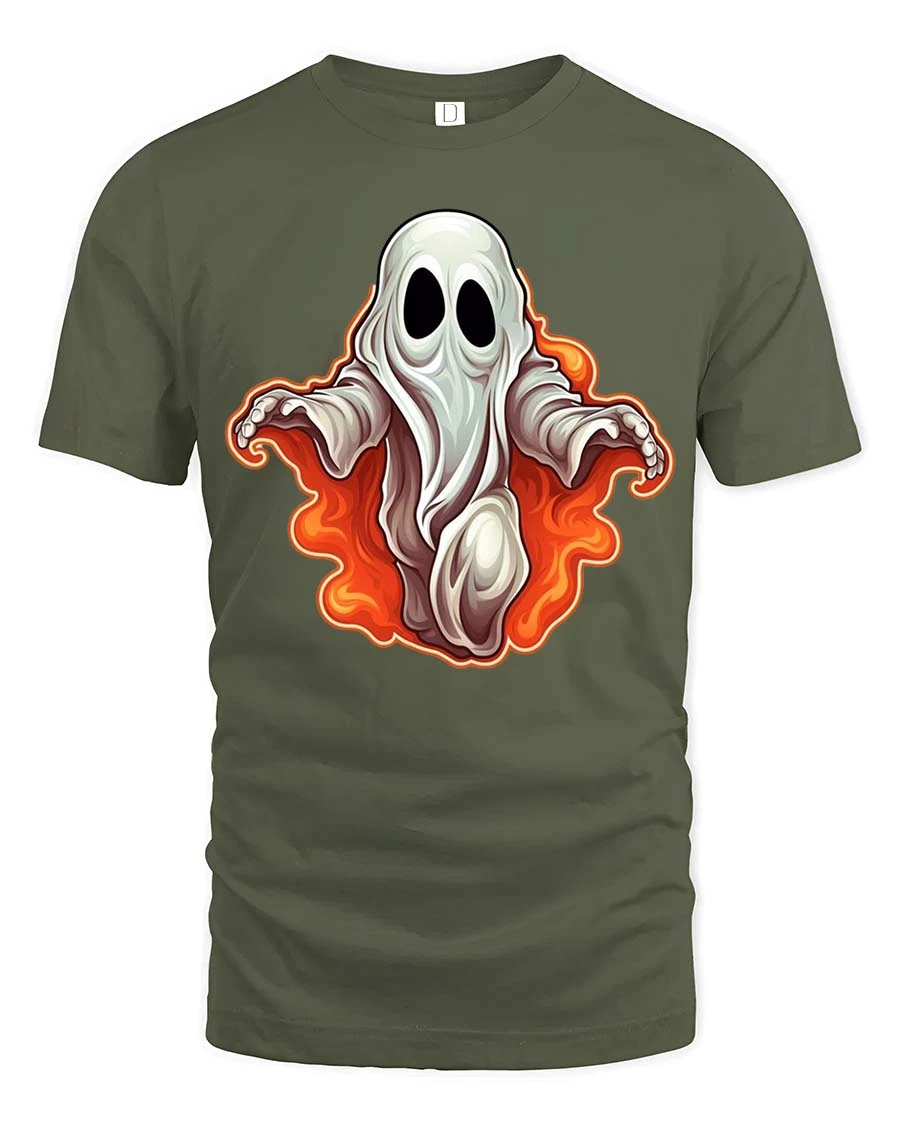 Spooky Cute Ghost Flame Graphic t-shirt Funny Halloween Tee - military green t-shirt on white background