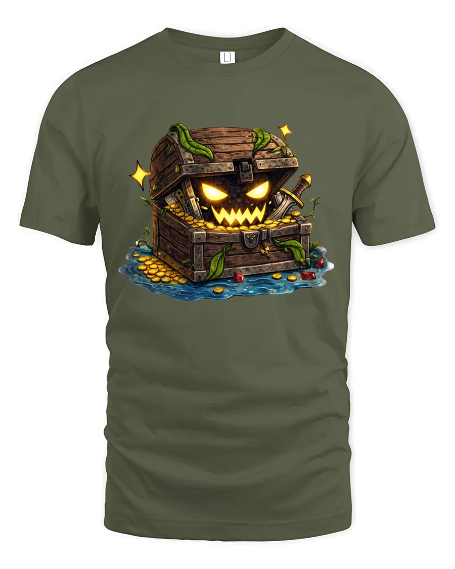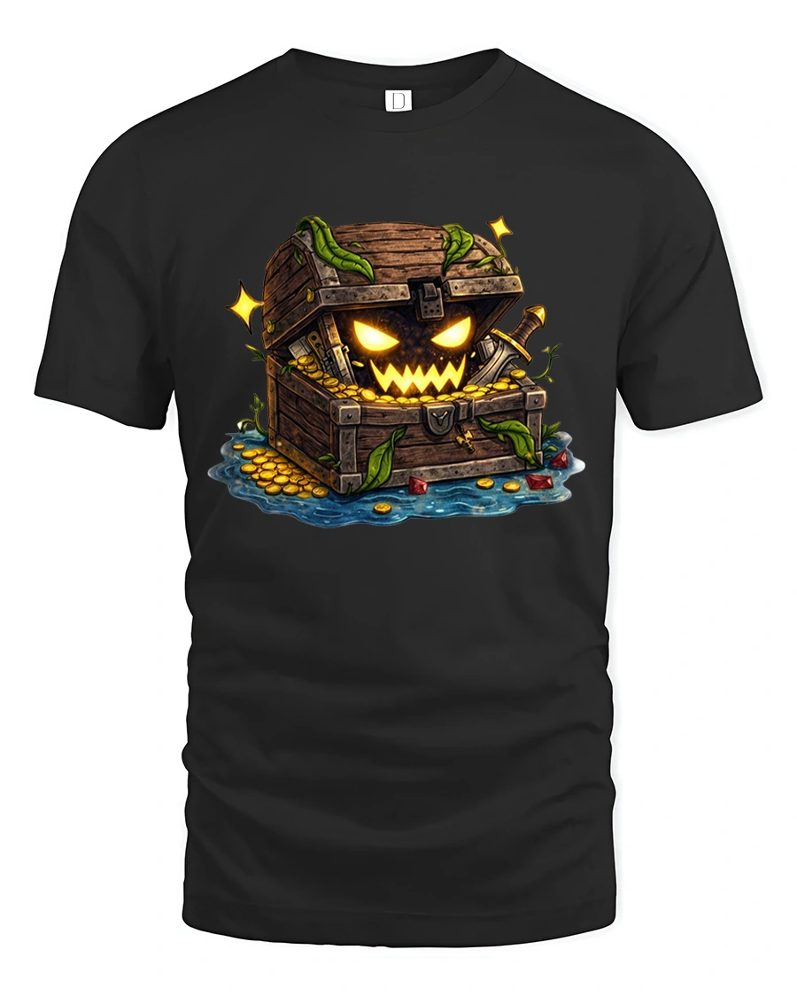 This treasure chest graphic tee features a mischievous monster chest filled with glowing gold and eerie expression.