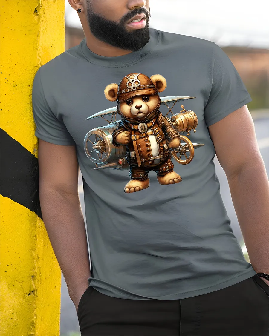 Steampunk Aviator Bear Pilot Graphic Adventure Tee blends vintage aviation style with playful charm, making it the perfect addition to your streetwear or casual collection. Featuring a bold design of a teddy bear dressed as a steampunk pilot, complete with goggles and an airplane in the background, this shirt brings together cuteness and adventure in one unique graphic.