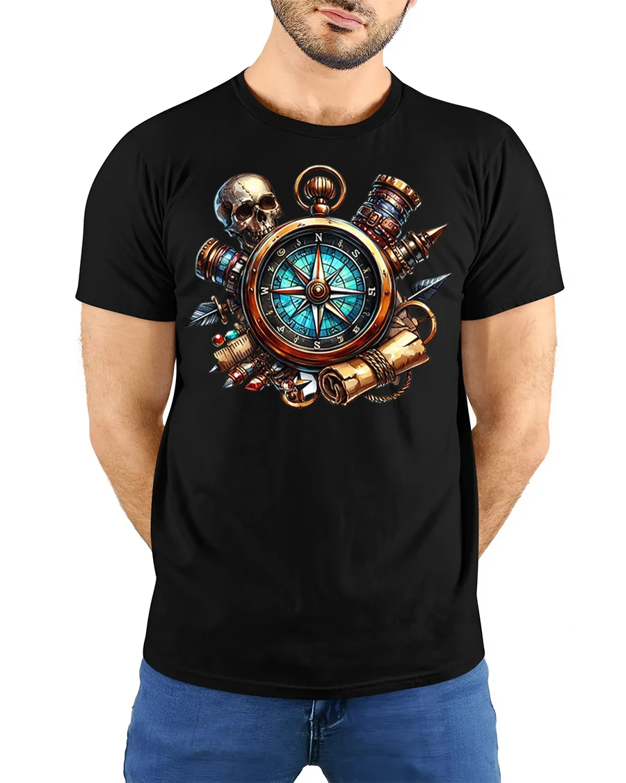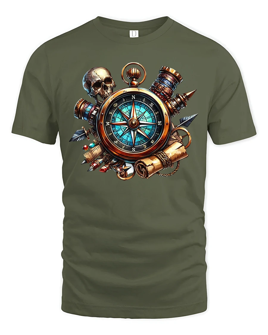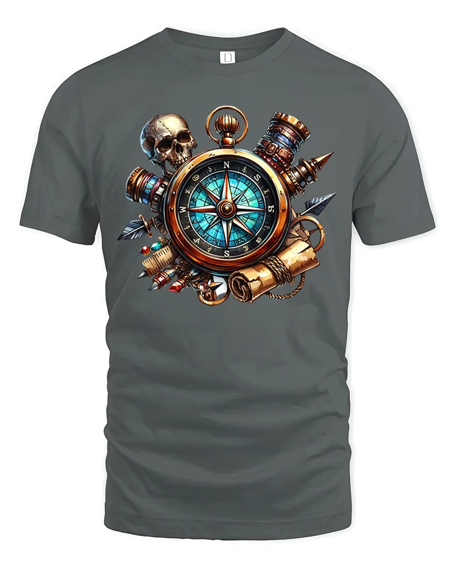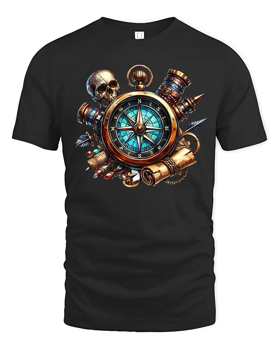 The Steampunk Compass Skull Adventure Graphic Tee With Vintage Detail represents direction curiosity and fearless discovery.