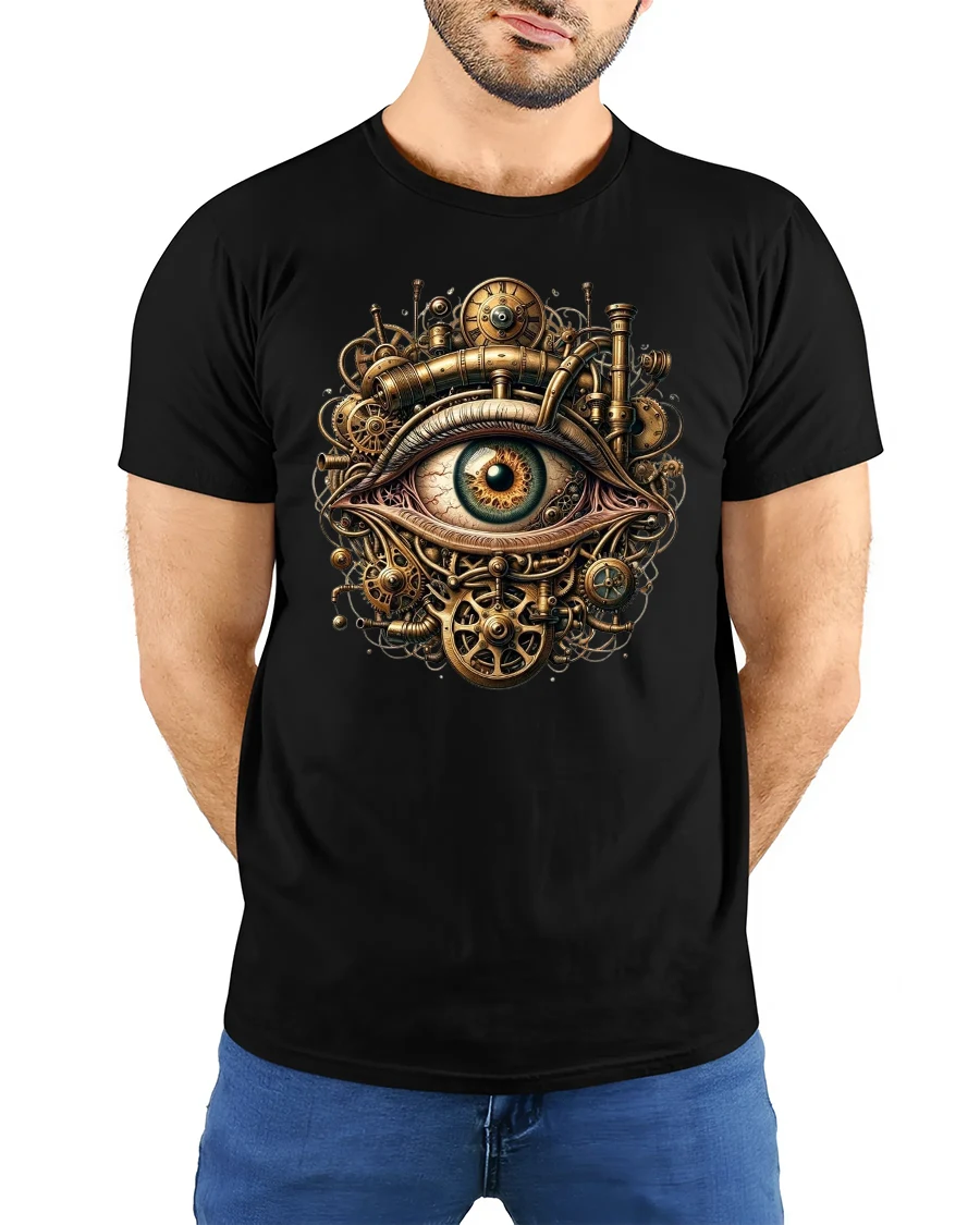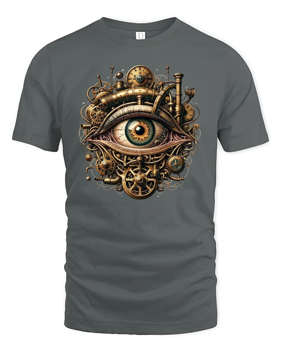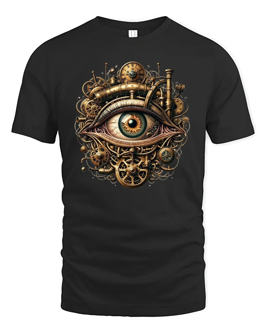 Featuring a hypnotic all-seeing eye surrounded by intricate gears, pipes, and brass clockwork, this tee captures the essence of retro-futuristic creativity.