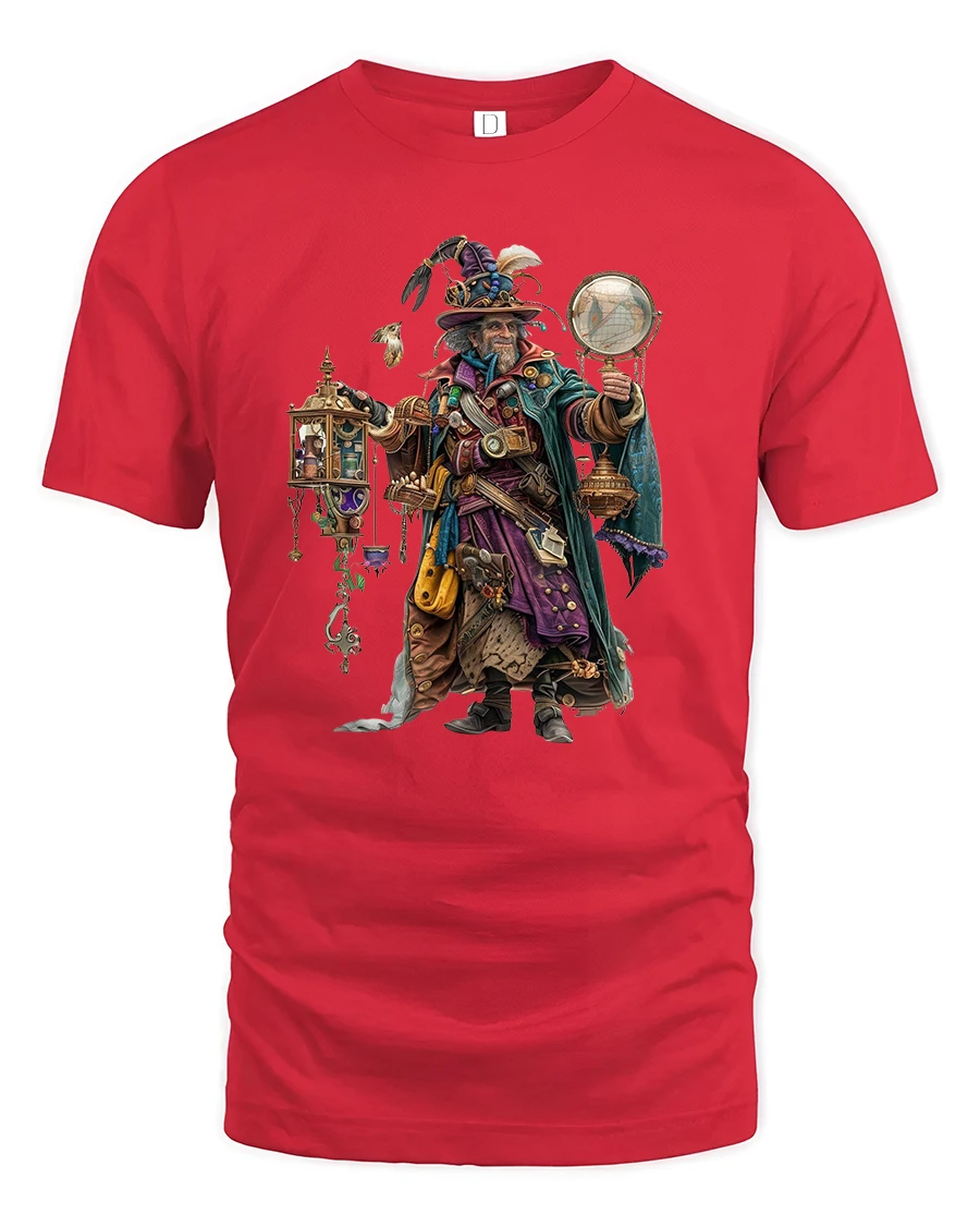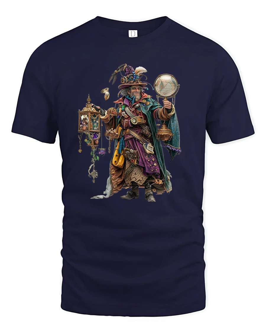 Featuring a brilliantly detailed design of a wise wizard holding mystical artifacts and steampunk gadgets, this tee perfectly blends fantasy and science.