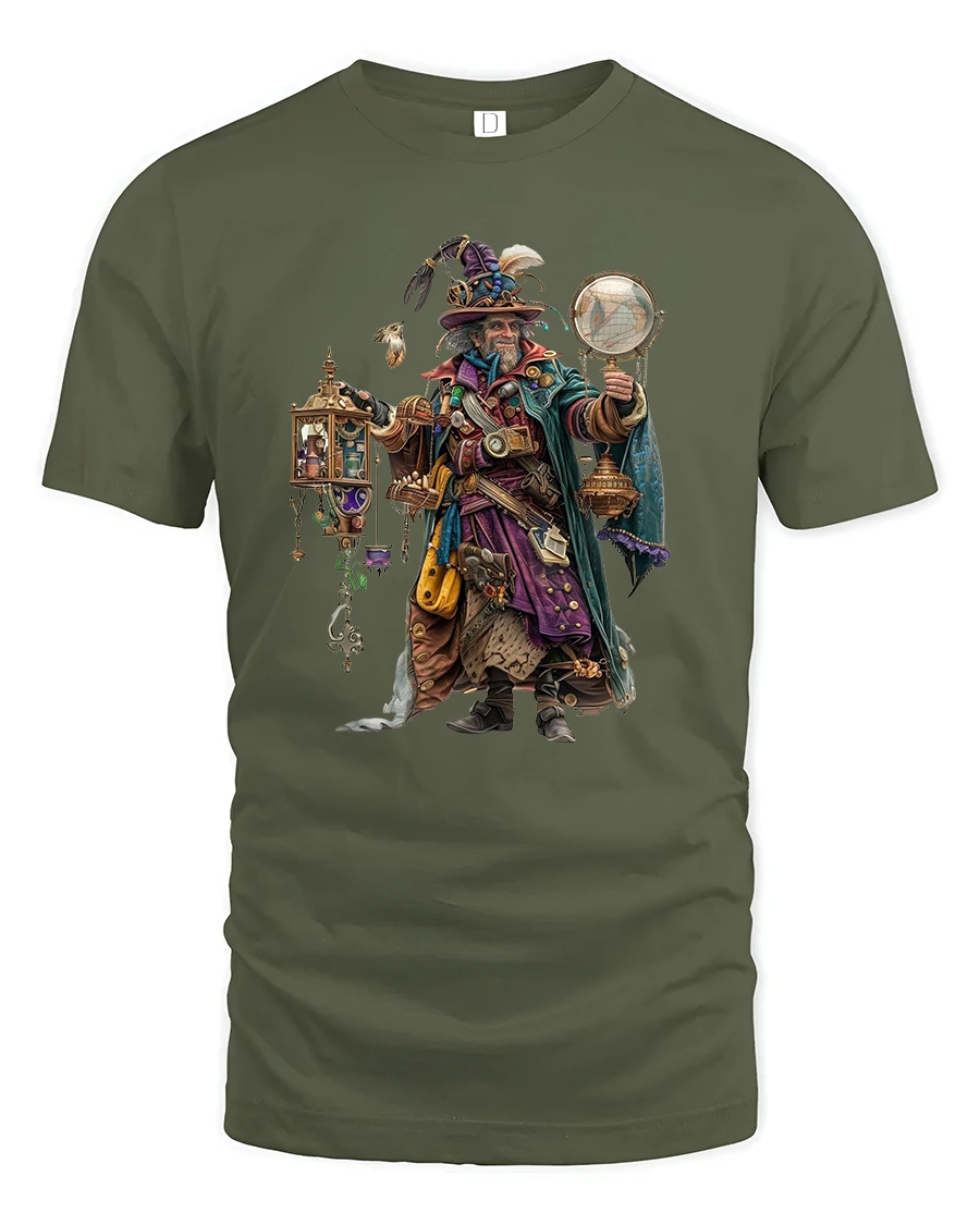 Step into a world of magic and invention with this Steampunk Wizard Explorer Fantasy Art T-Shirt.
