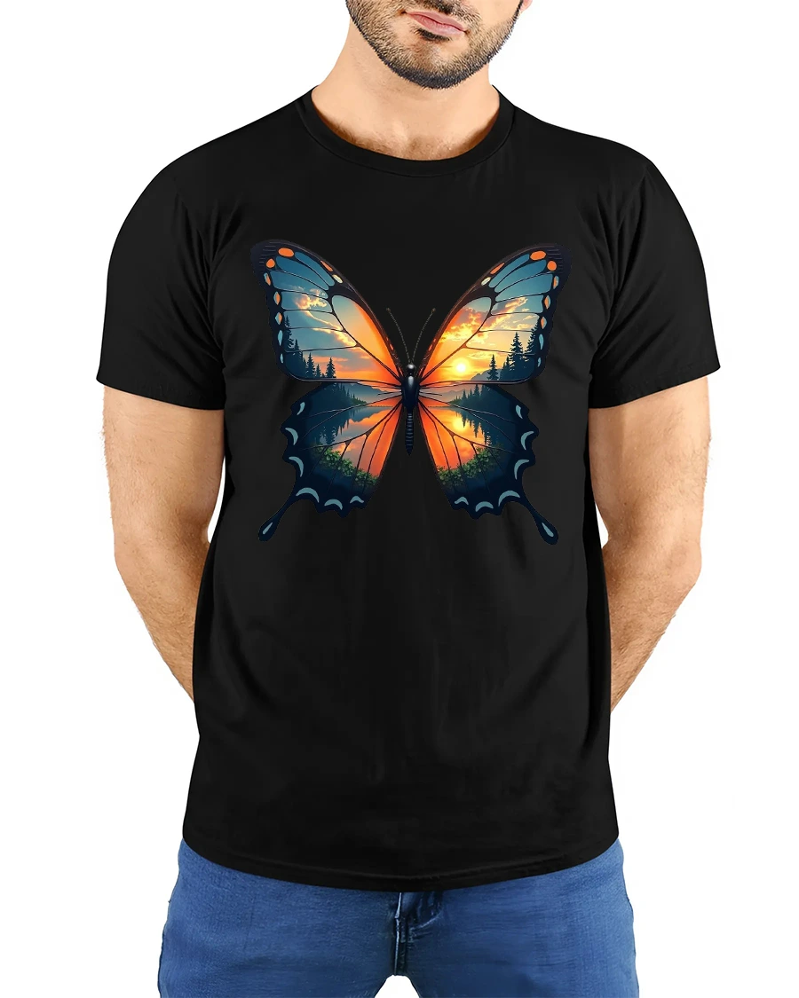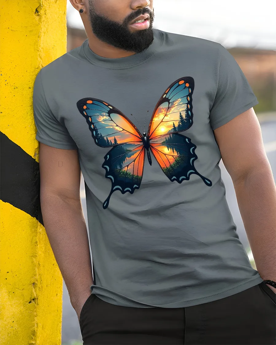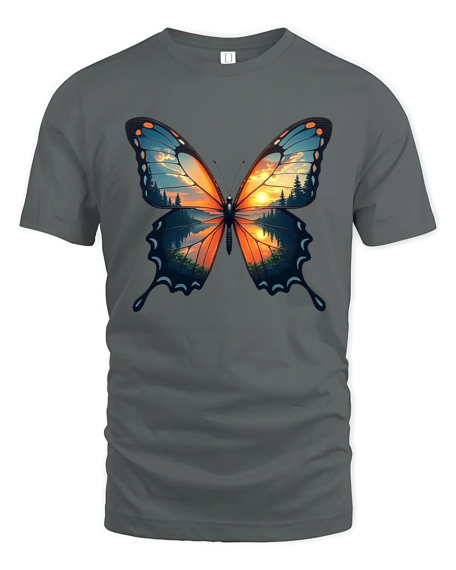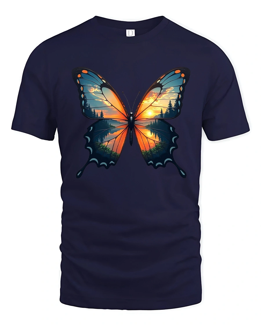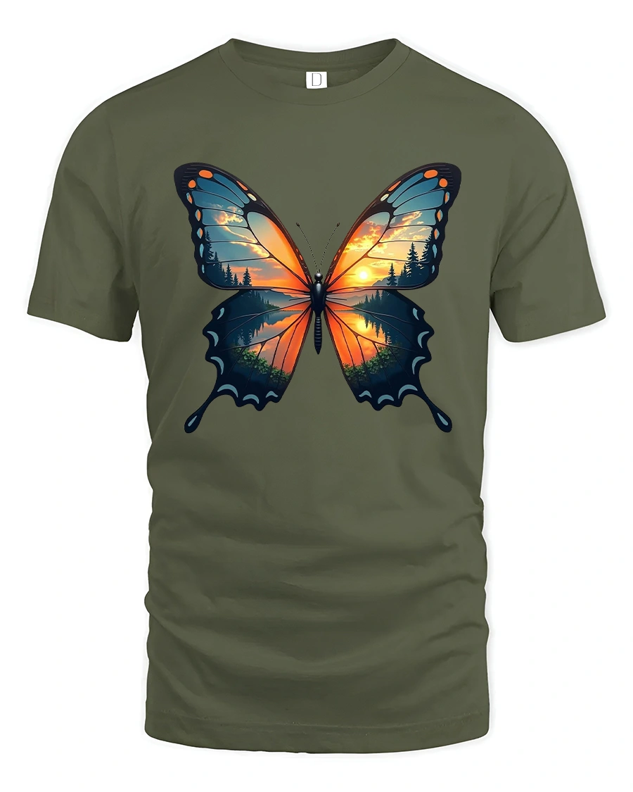 Sunset Forest Butterfly Nature Art Graphic T-Shirt captures the magic of nature in motion.