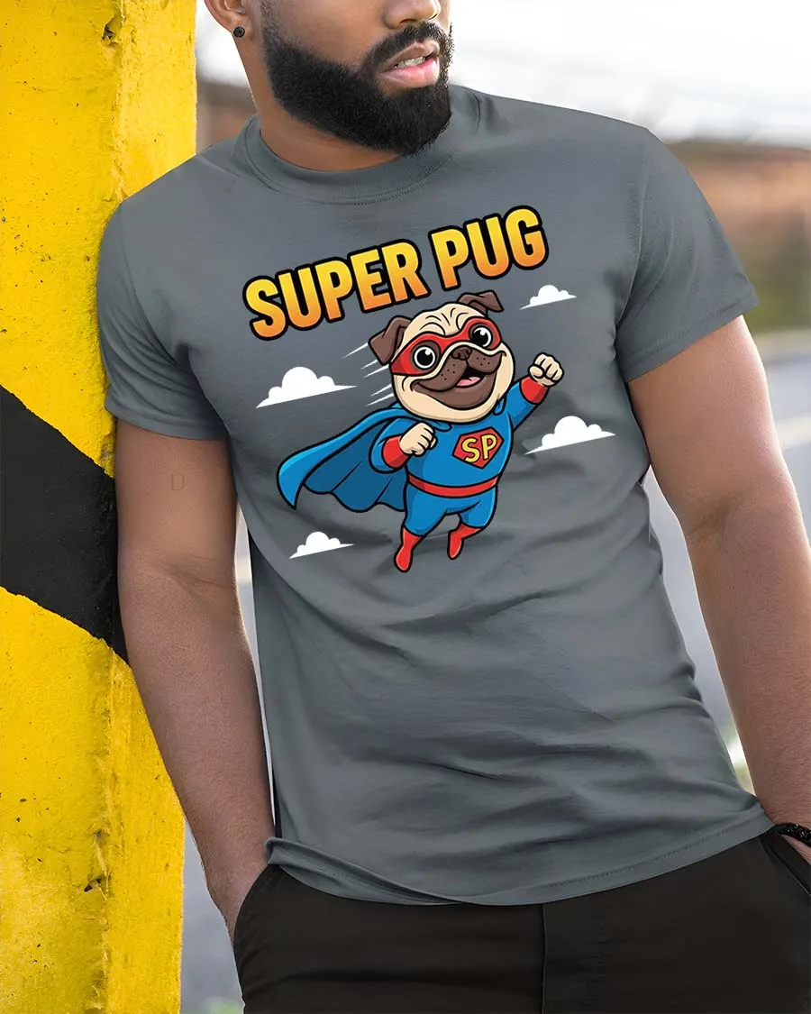 Featuring a cute pug dressed as a flying hero, this graphic captures humor, charm, and personality in one bold and colorful design.