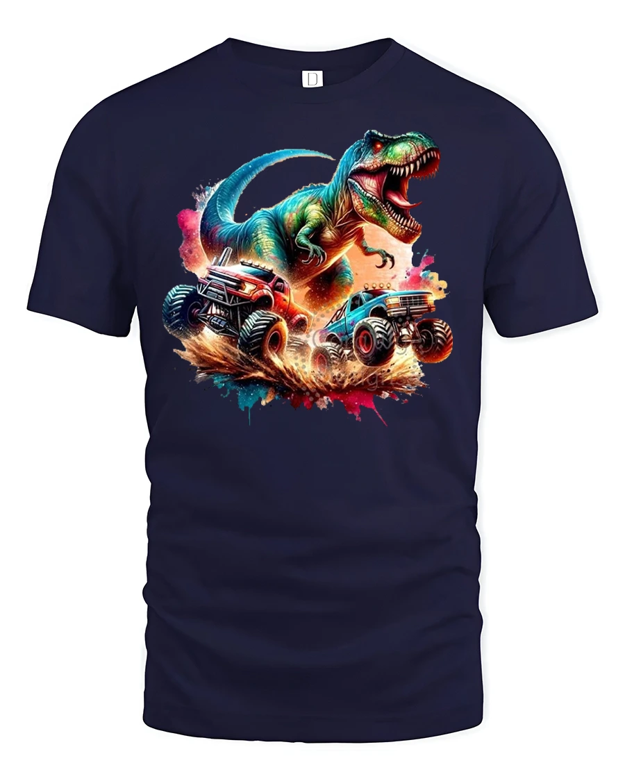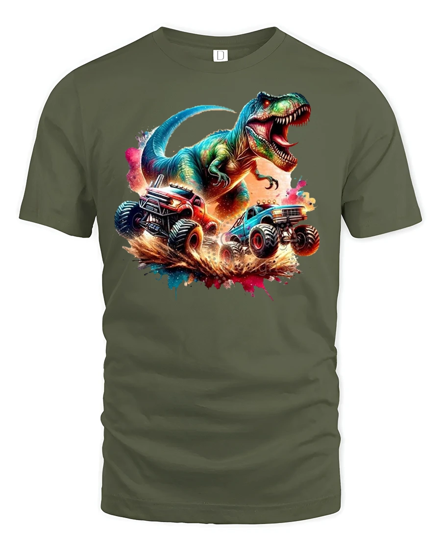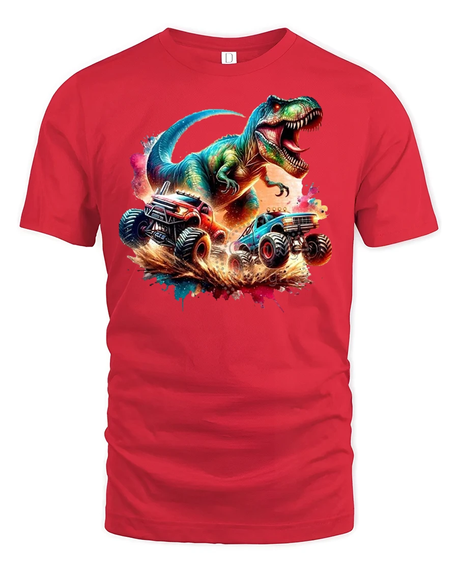 T-Rex vs Monster Trucks Action Graphic T-Shirt is the ultimate design for fans of dinosaurs, monster trucks, and bold statement fashion. Featuring a roaring T-Rex towering over two racing monster trucks, this shirt captures the perfect mix of power, speed, and adventure. The vibrant colors and explosive action-packed design make it a must-have for anyone who loves high-energy graphics.