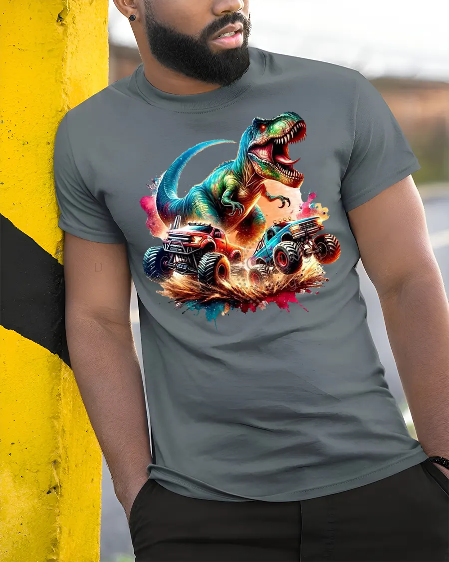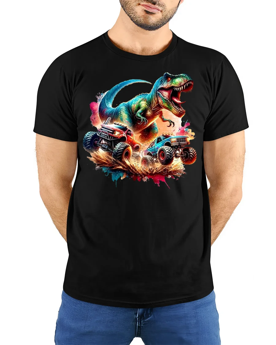 This T-Rex vs monster trucks action graphic t-shirt is crafted from soft, breathable fabric that ensures all-day comfort. The high-quality print keeps the details crisp and the colors vivid, even after multiple washes. Perfect for casual wear, parties, racing events, or simply standing out in style, this tee delivers durability and boldness in one package.