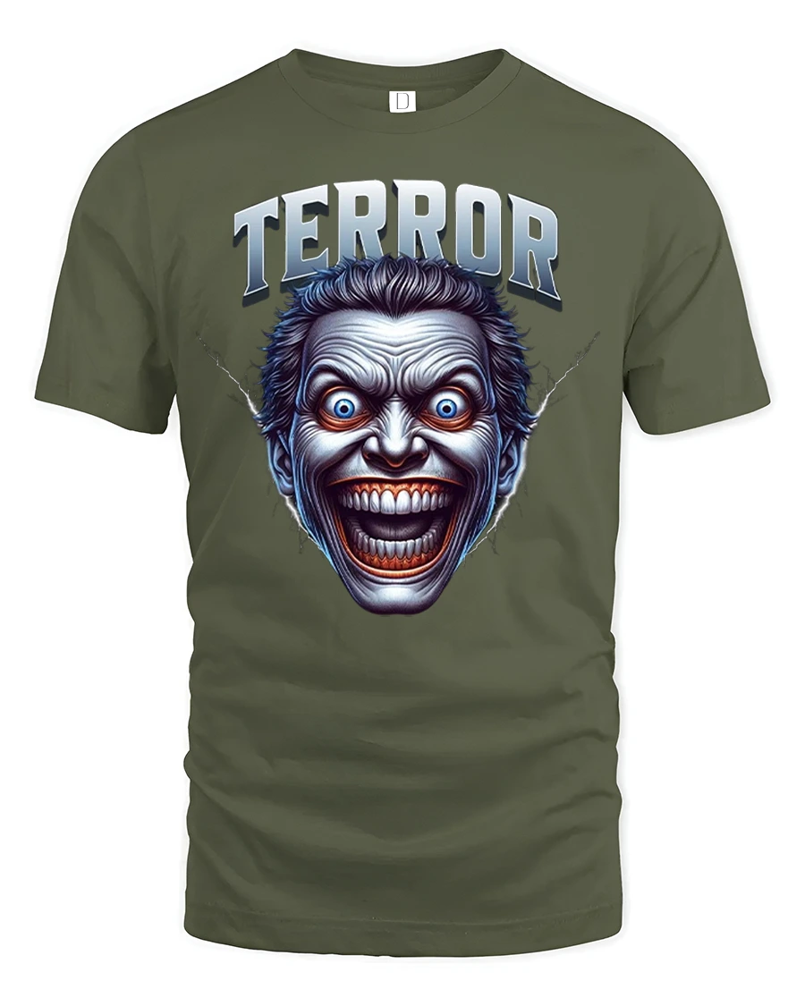 Terror Face Horror Graphic Scary Clown T-shirt is a bold statement piece for horror lovers and thrill-seekers. Featuring a chilling wide-eyed face with a terrifying grin, this tee captures the essence of pure fear and makes it perfect for Halloween or year-round gothic style.
