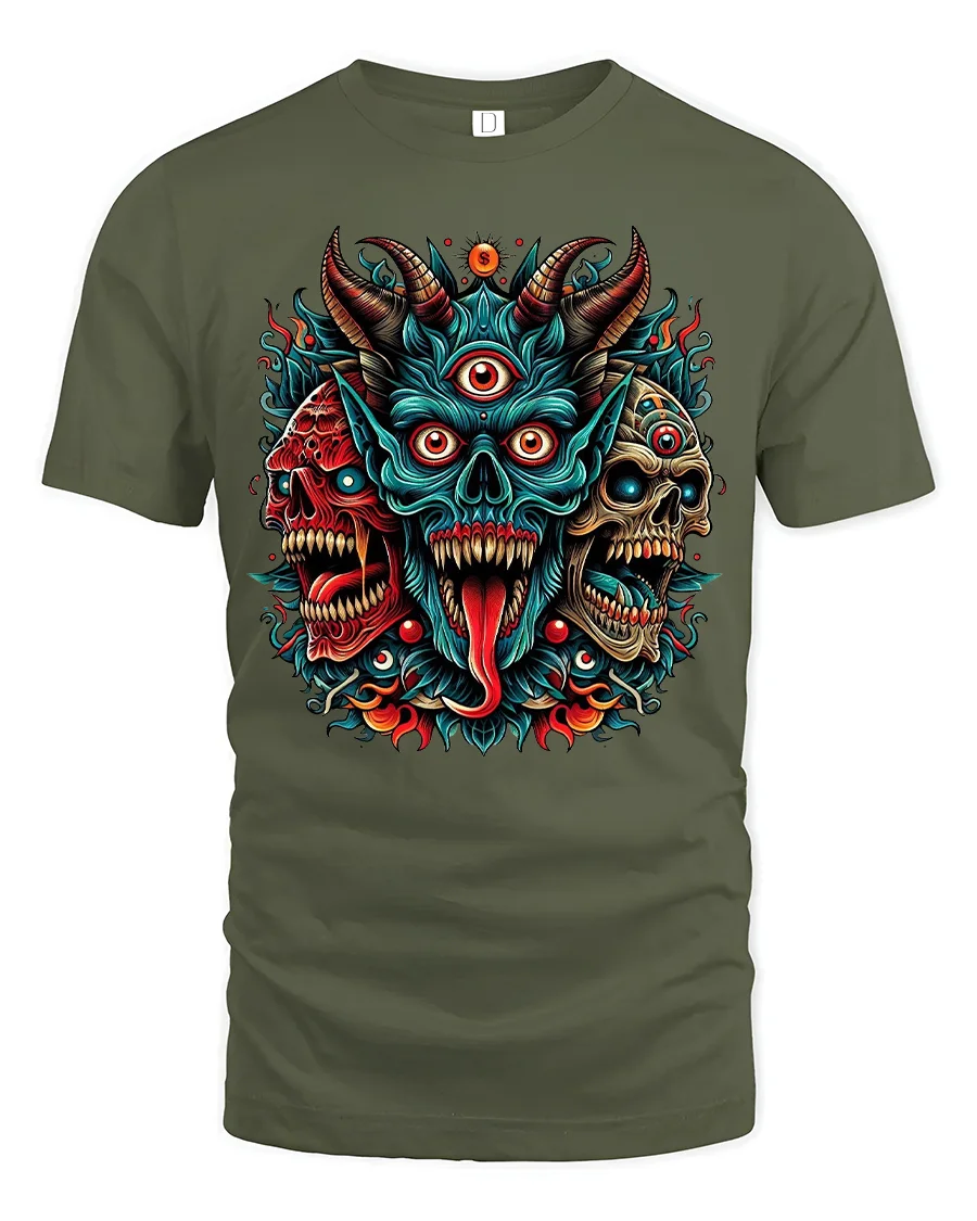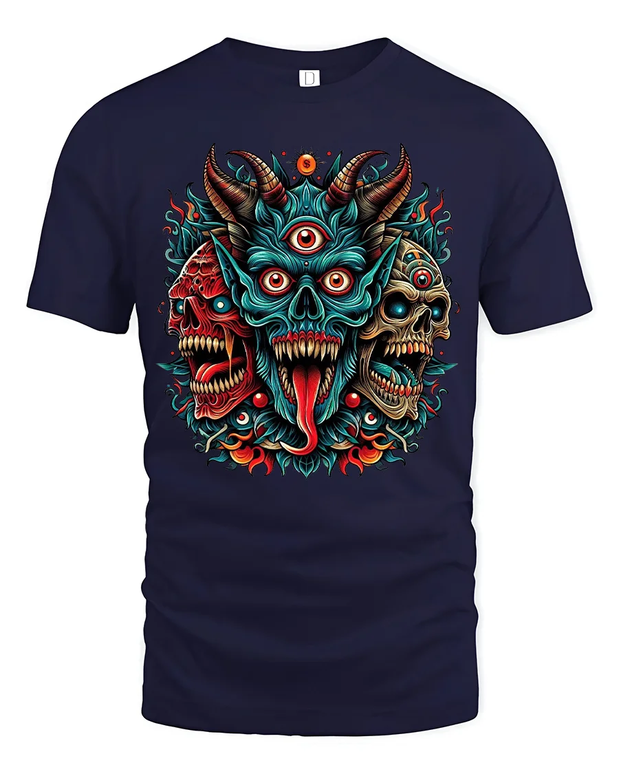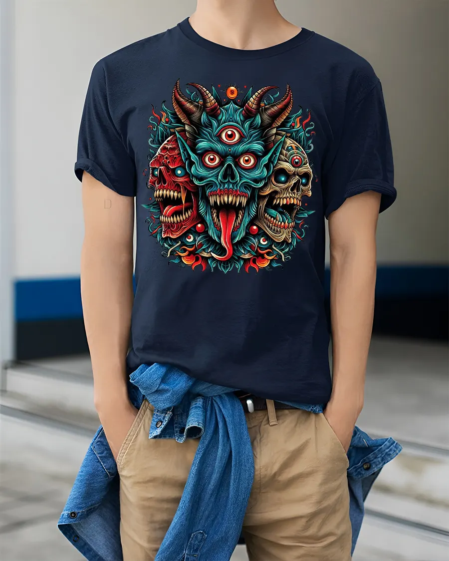 This Three Eyed Demon Skull Tee Fierce Tribal Horror Artwork delivers a bold and electrifying statement with its vivid, high-detail design. Featuring three menacing skulls merged into a powerful demonic form, this graphic blends tribal energy, horror elements and fiery accents into one unforgettable piece. The central three-eyed demon bursts with intense color and aggressive expression, creating a visually striking artwork that instantly commands attention.