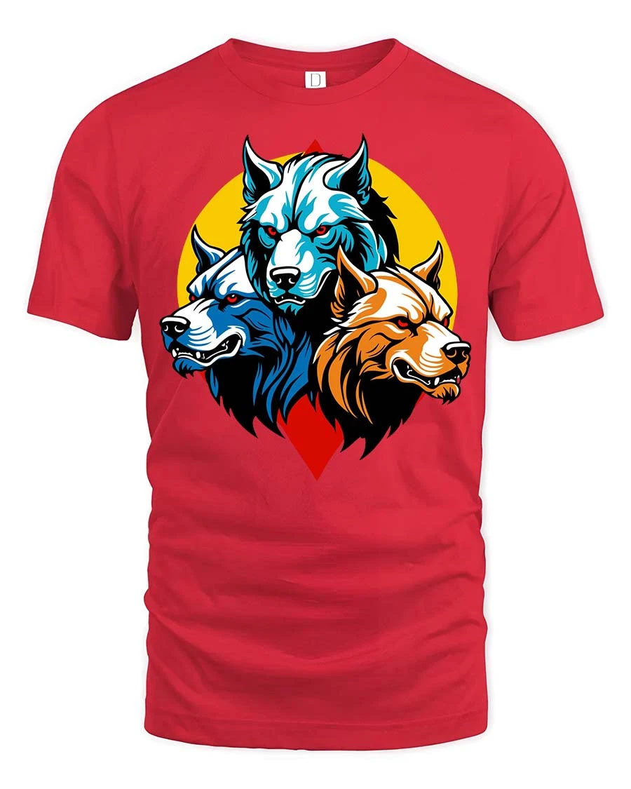 Three Wolf Head T-Shirt Fierce Wolf Pack Graphic Animal Tee - red t-shirt on white background