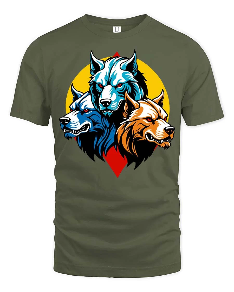 Three Wolf Head T-Shirt Fierce Wolf Pack Graphic Animal Tee - military green t-shirt on white background