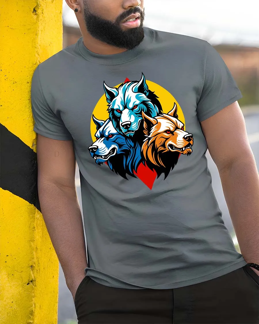 Three Wolf Head T-Shirt Fierce Wolf Pack Graphic Animal Tee features a bold design of three powerful wolf heads representing strength, unity, and leadership.
