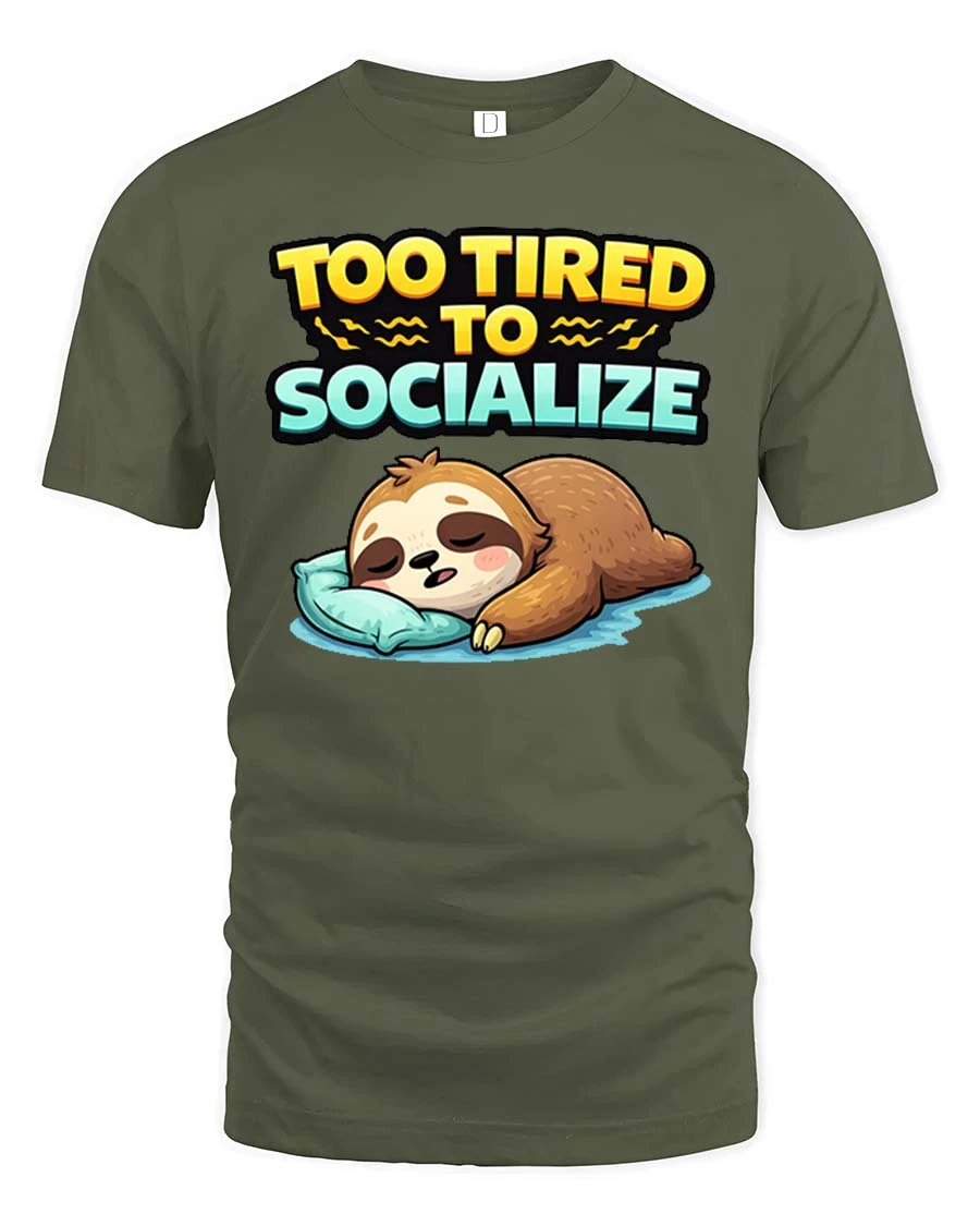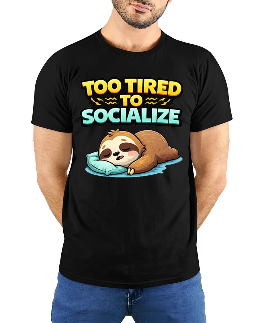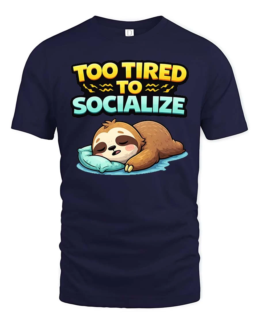 Too Tired To Socialize Funny Sleeping Sloth Graphic T-shirt captures the perfect mood for anyone who prefers quiet comfort over crowded plans.