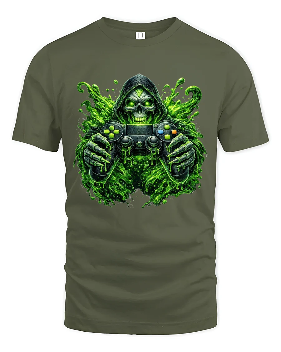 Toxic Gamer Skull Graphic Tshirt Neon Horror Gaming Art Tee delivers a powerful mix of gaming passion and dark fantasy style.