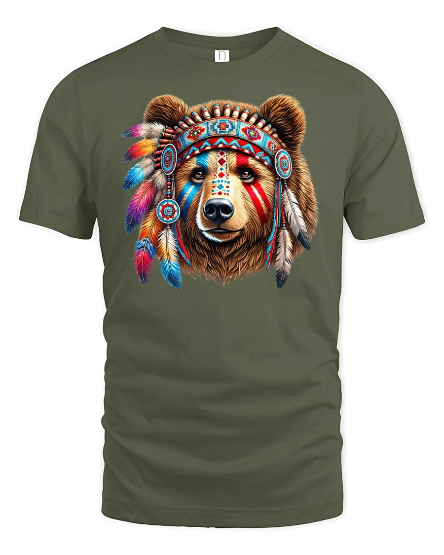 Tribal Bear Warrior Graphic T-Shirt with Feathers is a bold fashion choice for those who love powerful animal designs. Featuring a majestic bear head adorned with a colorful feather headdress, this tee combines strength, spirit, and eye-catching style in one striking print.