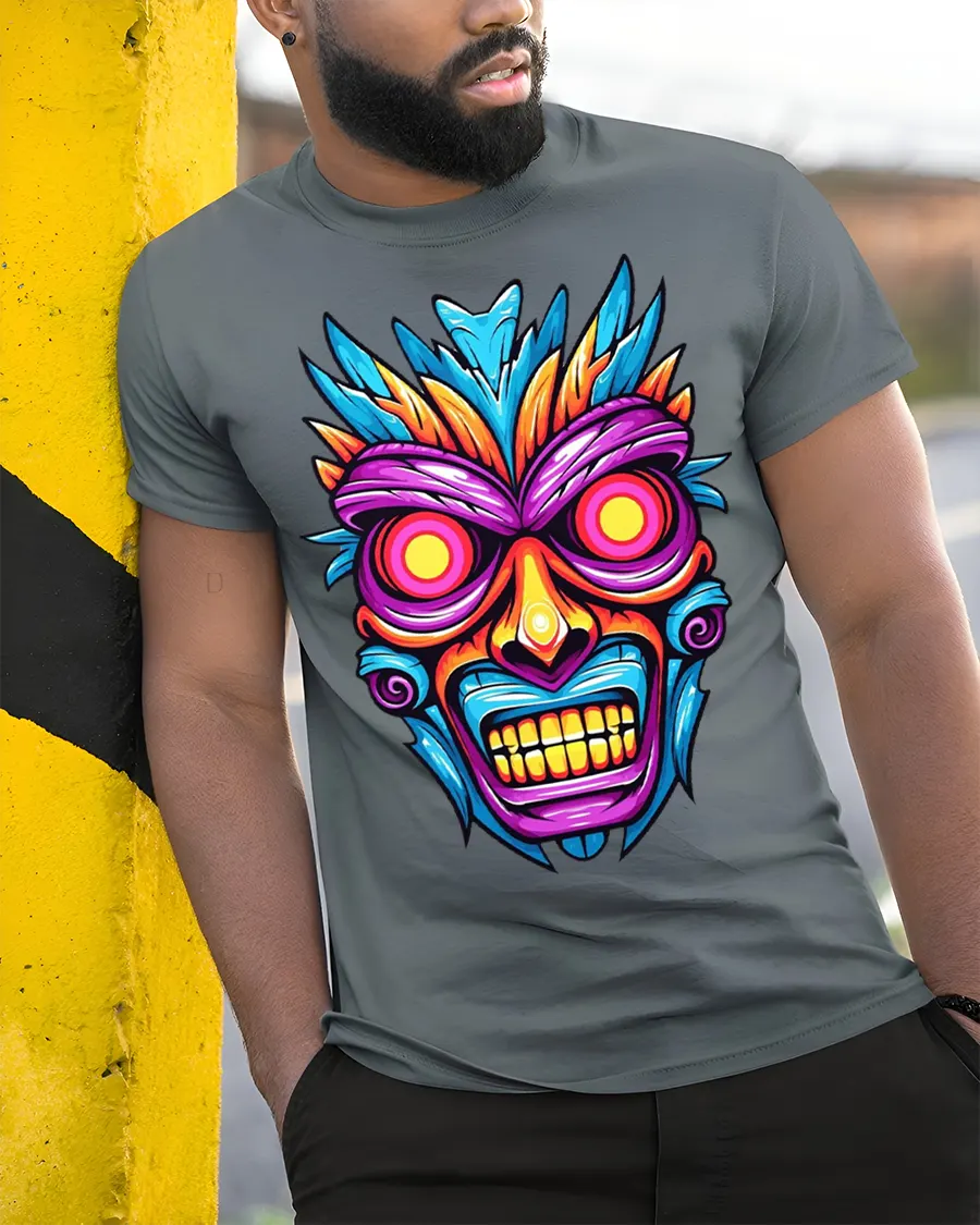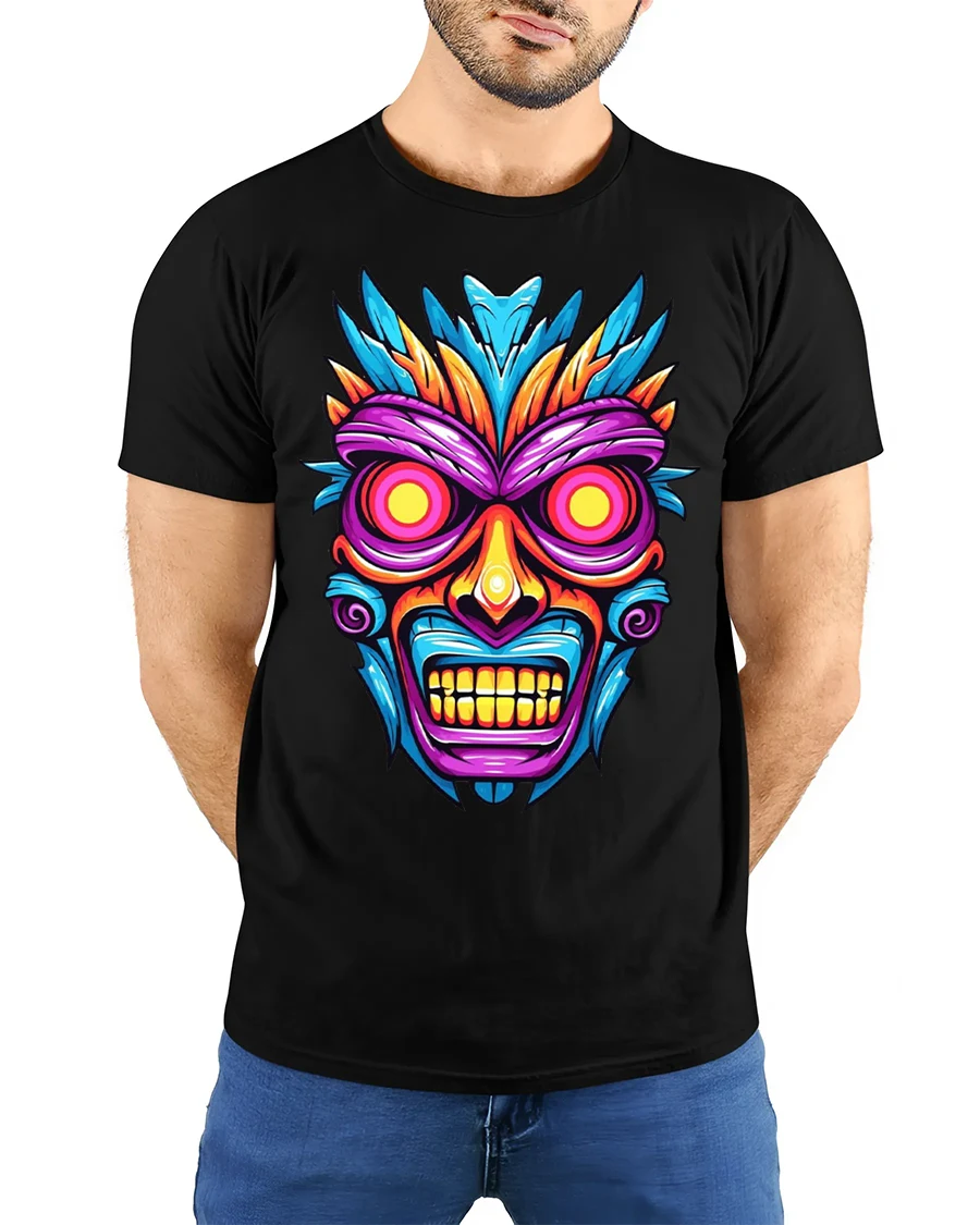 The tribal skull graphic t shirt delivers a bold visual impact that instantly stands out with its electric colors and striking illustration.