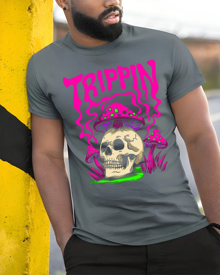 Trippin Skull Mushroom Psychedelic Graphic T Shirt Art celebrates imagination freedom and bold self expression.