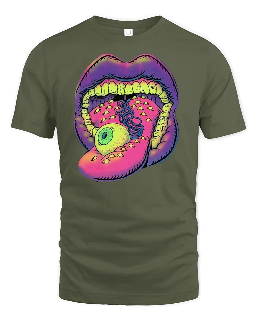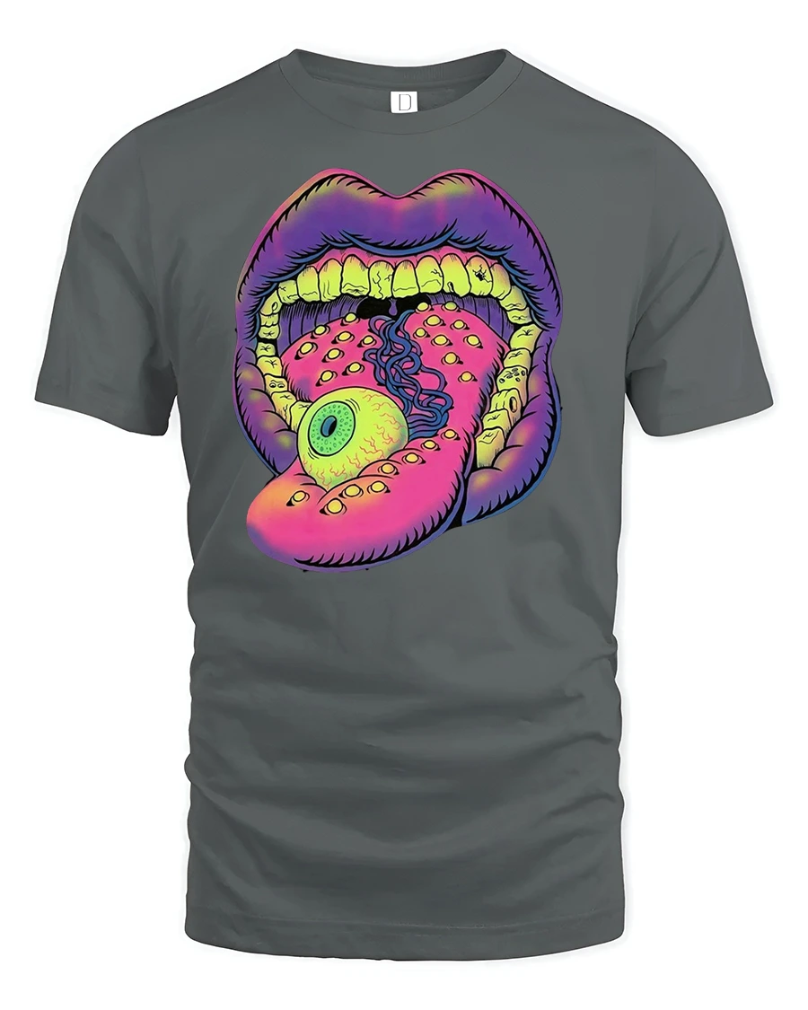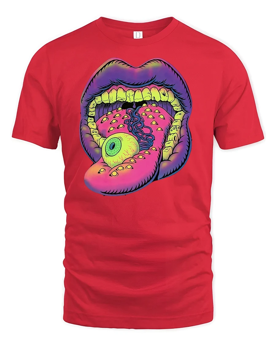Featuring a surreal open mouth with an eyeball tongue and vibrant neon colors, this design screams originality and fearless energy.