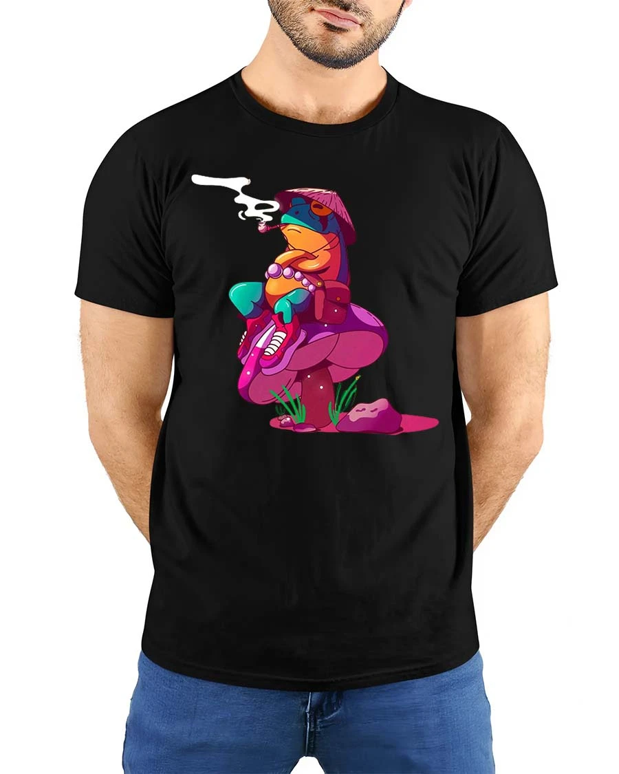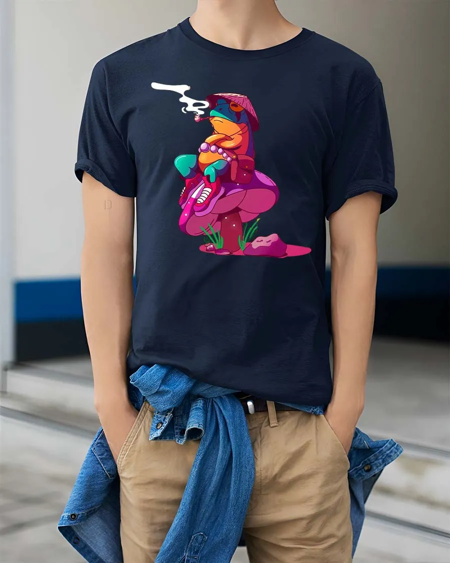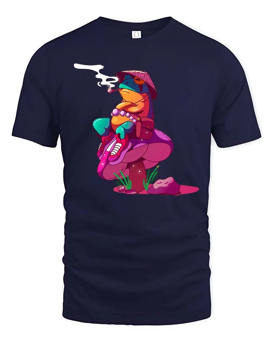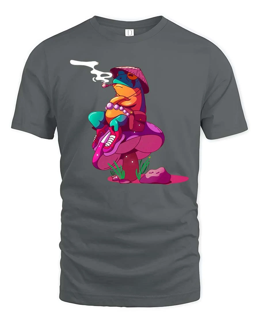Trippy Frog Mushroom Psychedelic Weird Cartoon Art Tshirt pairs easily with modern casual outfits and bold lifestyle aesthetics.