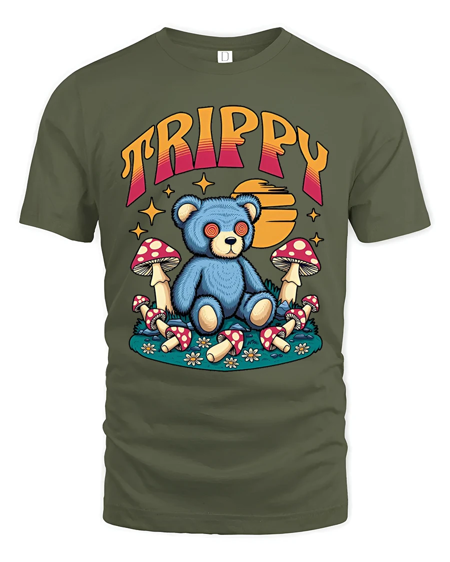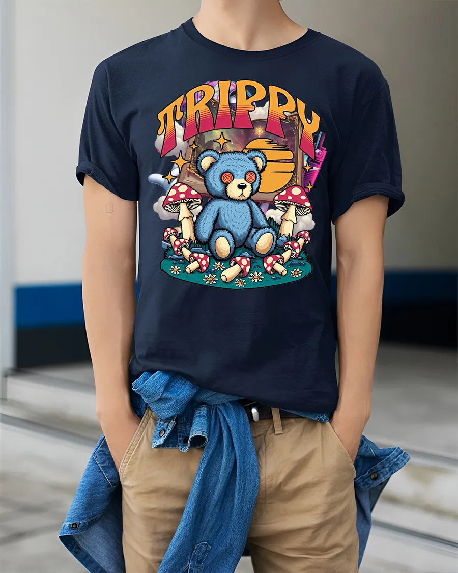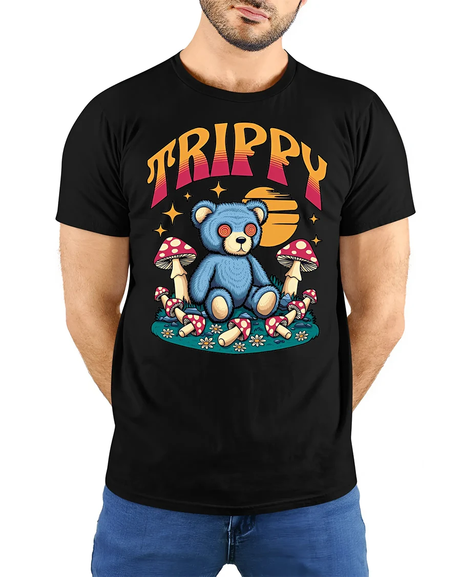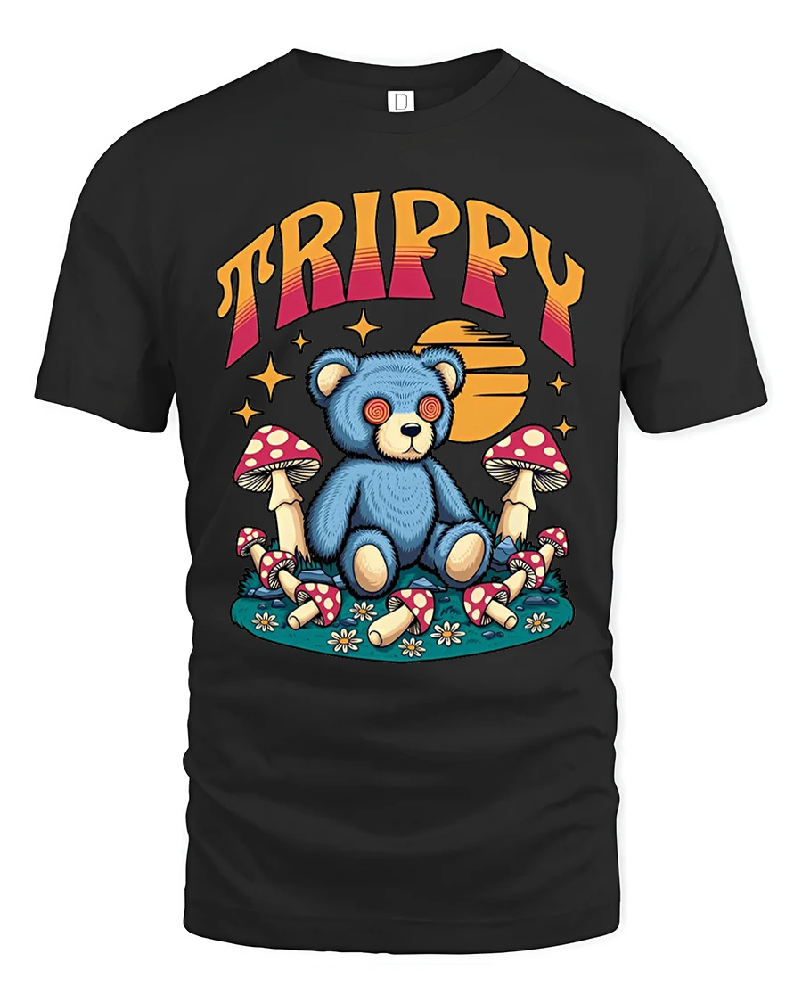 Trippy Teddy Bear Graphic Tee Psychedelic Mushroom Art delivers a playful mix of cute and surreal with a wide eyed teddy bear surrounded by colorful mushrooms and dreamy retro elements.