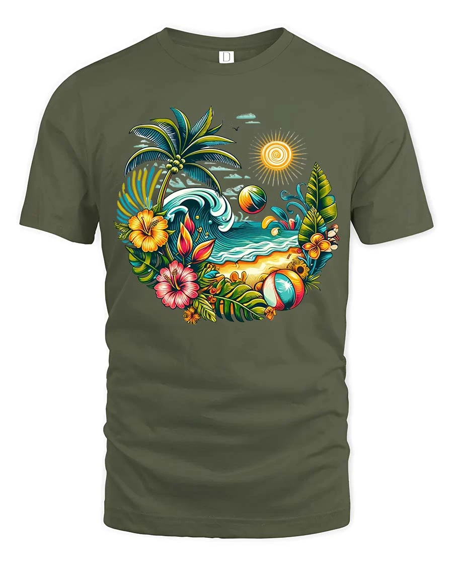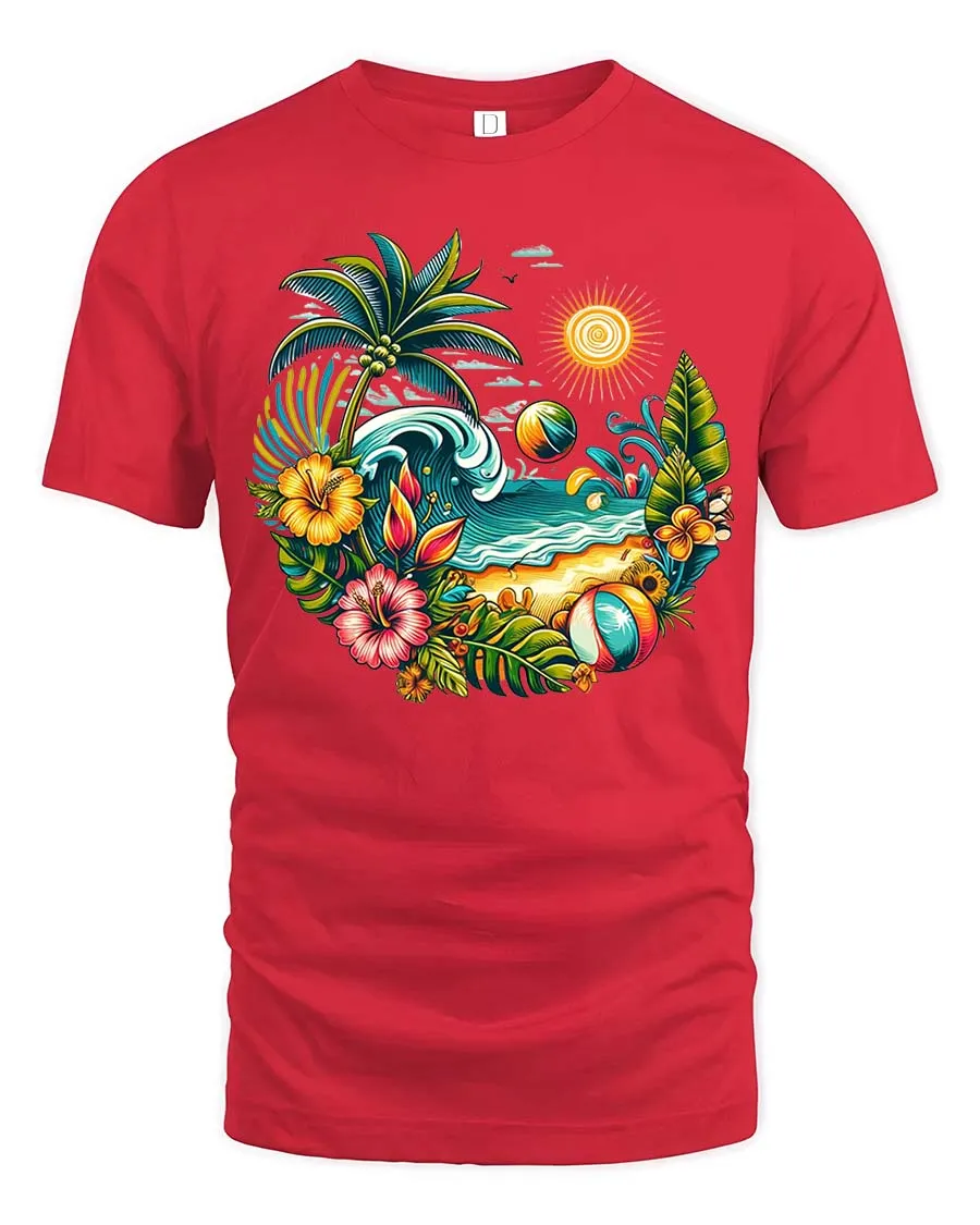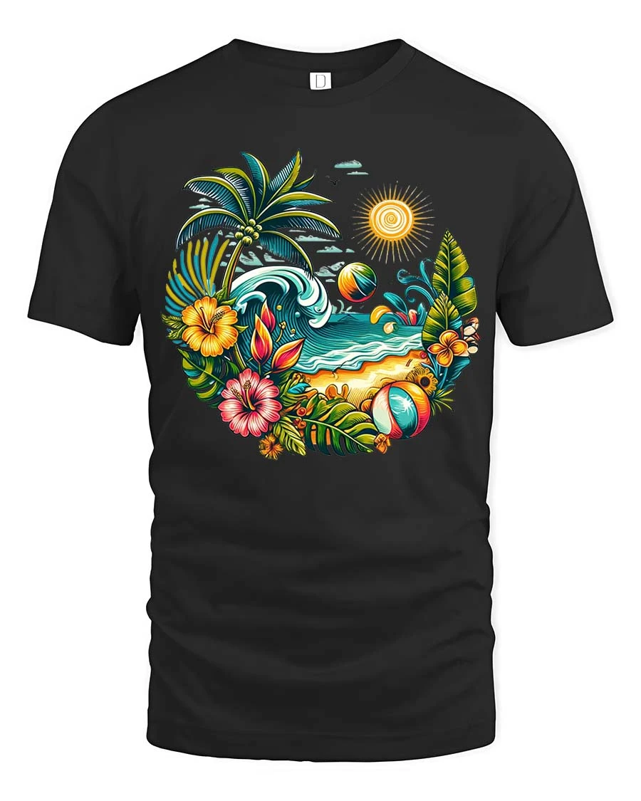 The bright tropical artwork creates a lively beach atmosphere, making this t-shirt a perfect choice for vacation lovers and fans of summer-inspired designs.