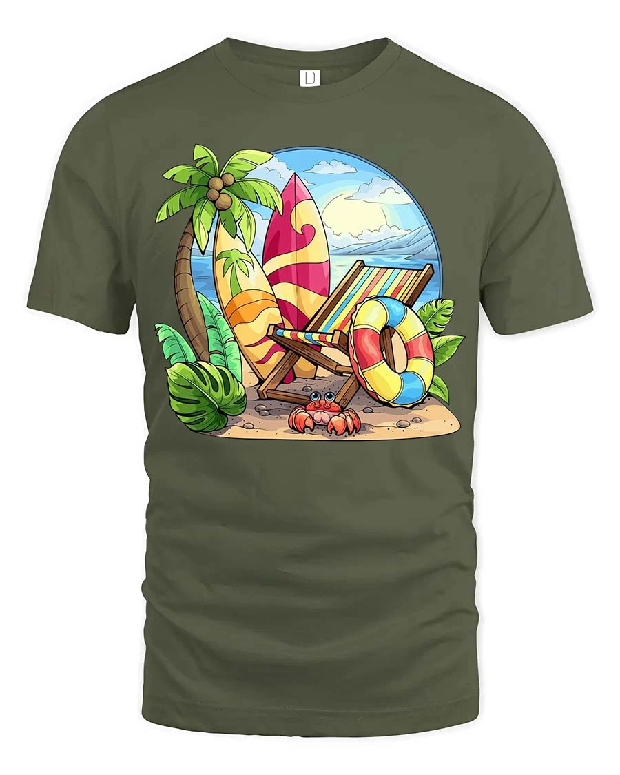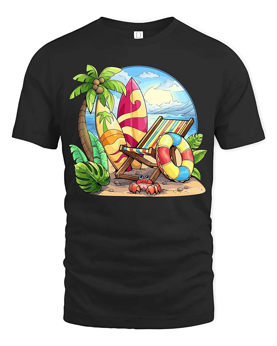 The Tropical Beach Vacation T-Shirt captures the relaxing spirit of summer with a bright and cheerful beach scene. Featuring colorful surfboards, a striped beach chair, palm trees, and a sunny ocean view, the design instantly brings tropical vacation vibes. The playful illustration creates a fun summer atmosphere that makes this graphic t-shirt perfect for beach lovers, surfers, and anyone dreaming of warm ocean breezes and sunny days.