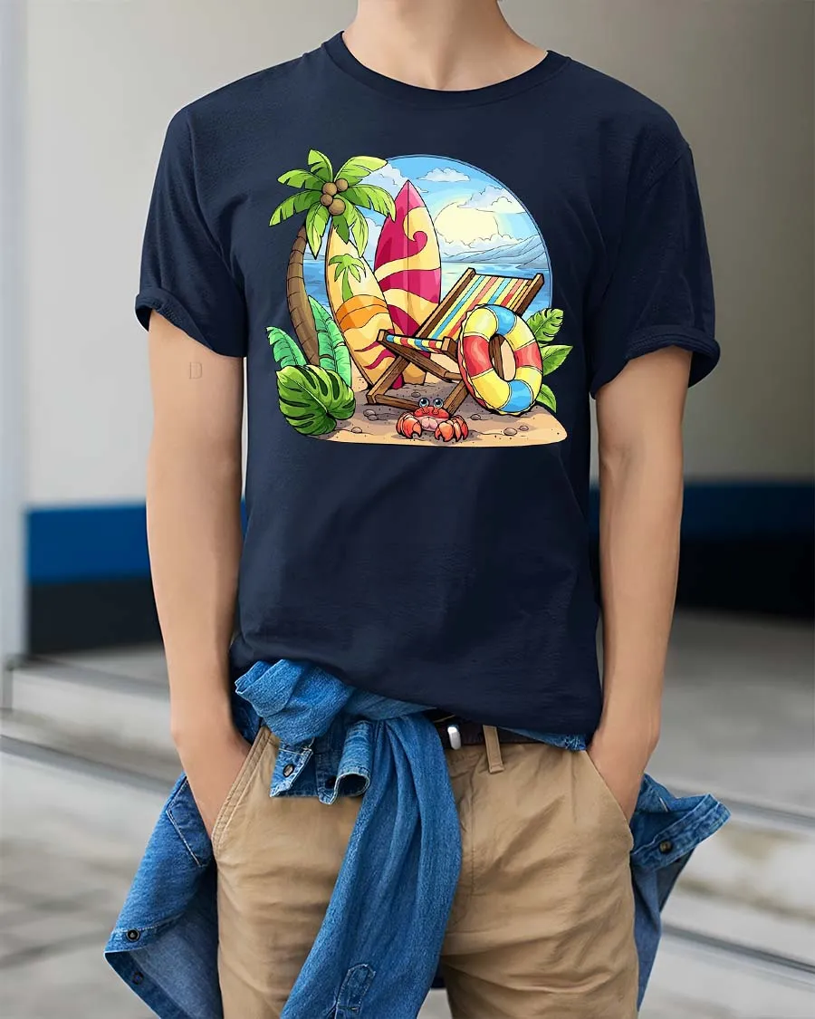 Designed for comfort and everyday wear, this t-shirt offers a soft cotton feel and a classic relaxed fit that pairs easily with shorts, jeans, or casual summer outfits. The vibrant beach artwork pops against the dark background, highlighting the tropical scenery and giving the shirt a bright, lively appearance. Whether you’re heading to the beach, planning a vacation, or simply enjoying warm weather activities, this graphic tee adds a cheerful summer style to your wardrobe.