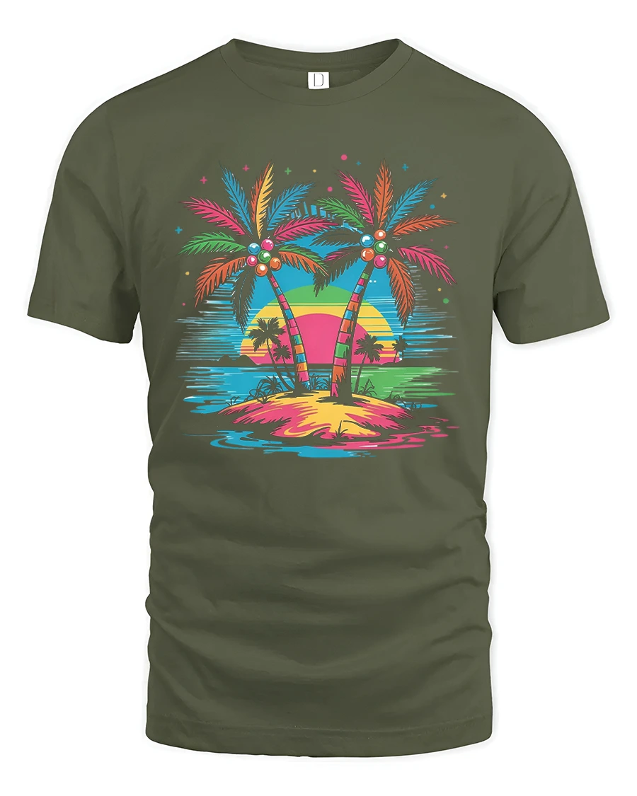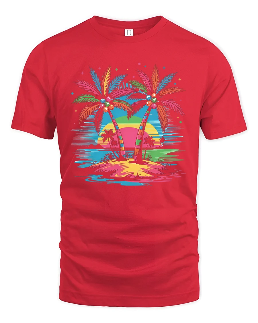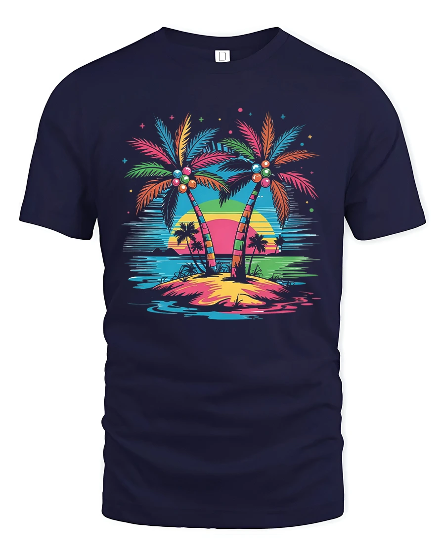 This tropical palm tree t shirt features vibrant palm trees standing against a colorful sunset over calm ocean waters creating a dreamy vacation inspired scene.