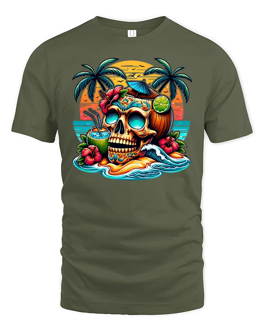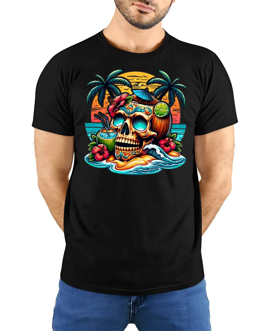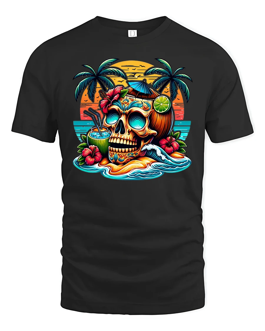 Featuring a colorful skull made from a coconut surrounded by hibiscus flowers, palm trees, and an orange sunset, this design is all about tropical chill with a bold twist.