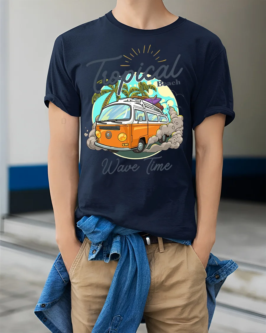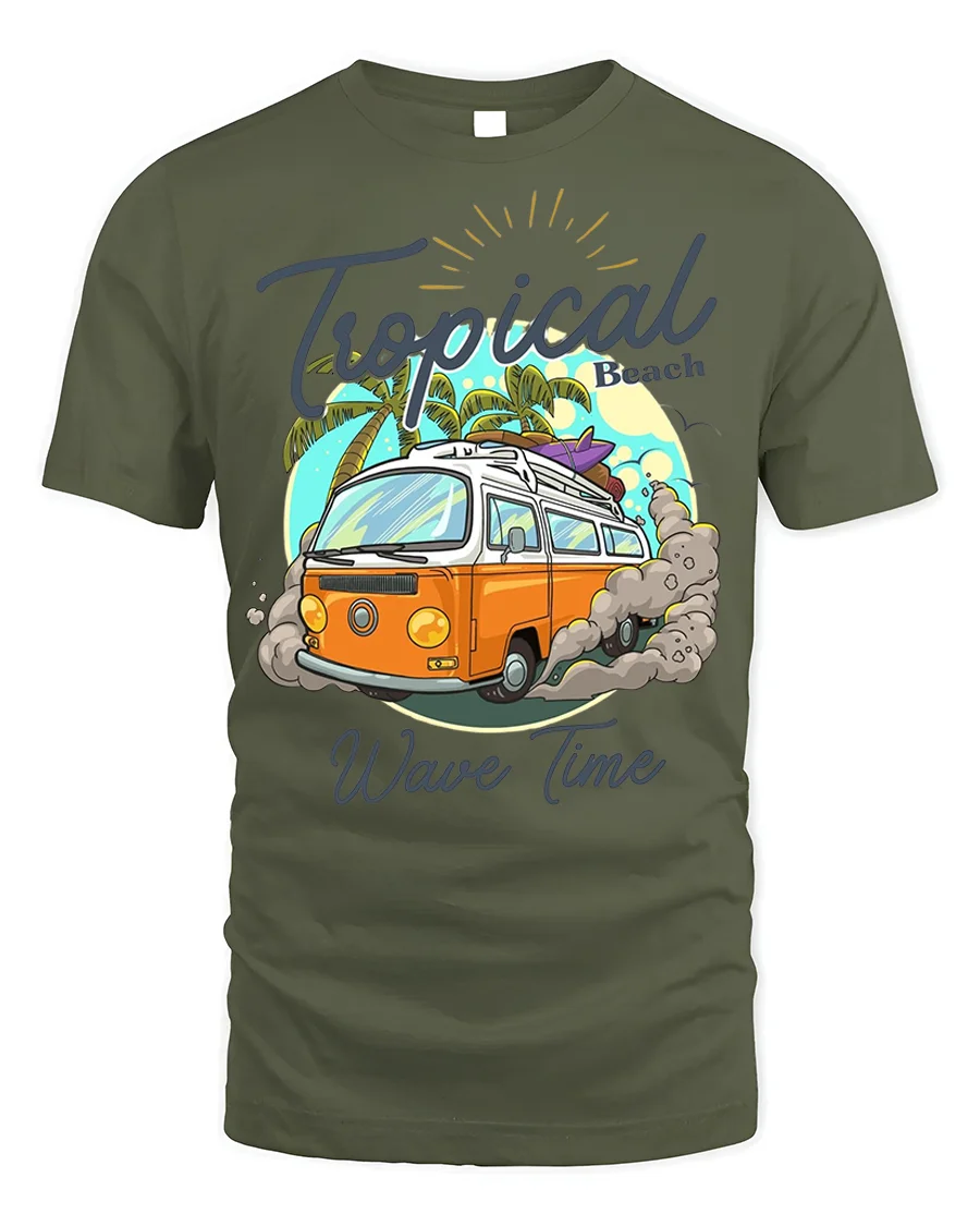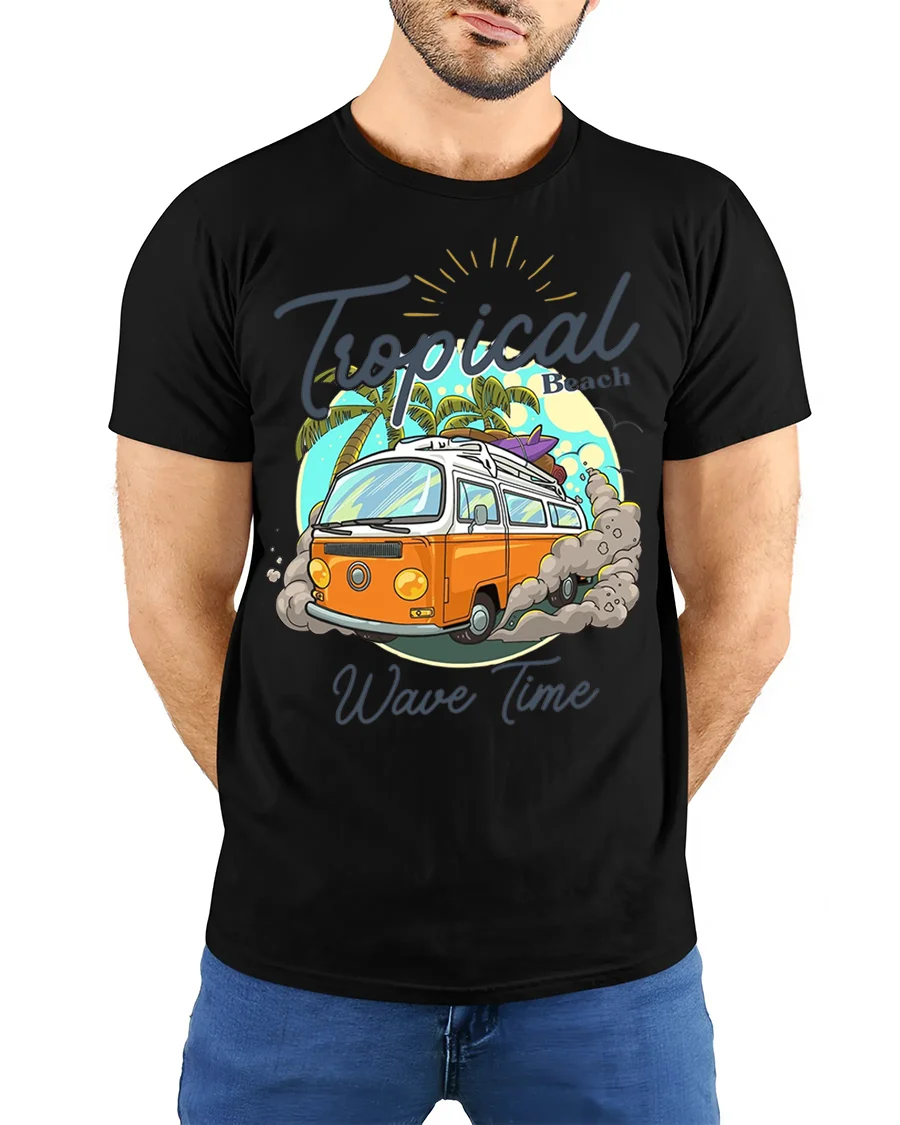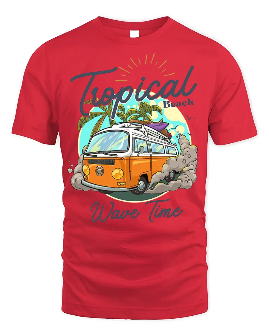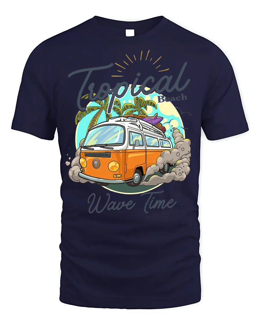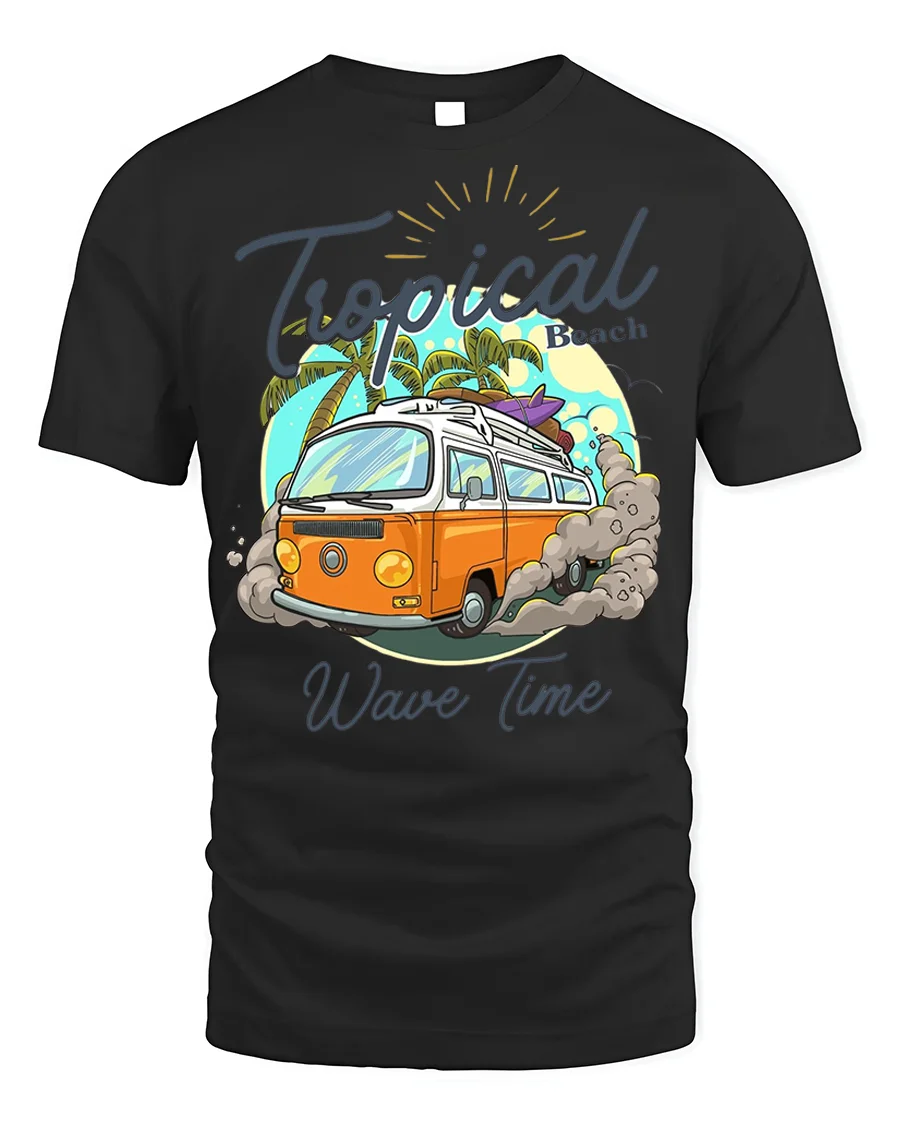 Hit the beach in style with our Tropical Wave Time Tee – Surf Van T-Shirt. This cool design features a classic orange surf van kicking up dust as it heads towards a tropical beach with palm trees and a vibrant sun. It perfectly captures the laid-back vibe of endless summer and ocean adventures.