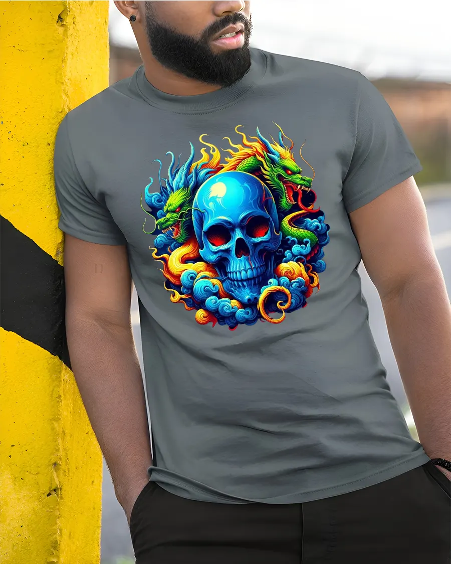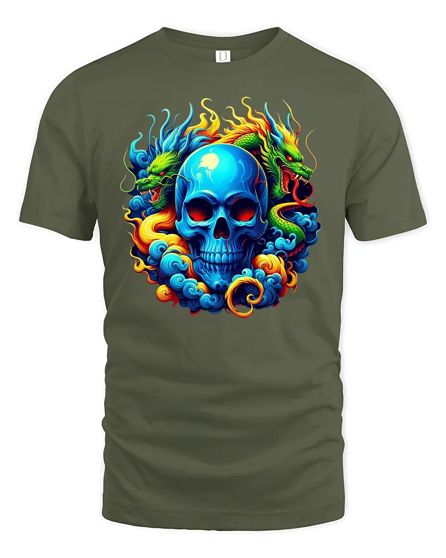 Crafted from soft and comfortable material, this t-shirt is ideal for everyday wear, festivals, gaming events, concerts, or any place where expressive style takes center stage. The high-quality print captures every fiery detail—from the dragons’ scales to the swirling smoke—ensuring a vivid and durable design that stands out. It’s also a fantastic gift for dragon lovers, skull art enthusiasts, or anyone who enjoys vibrant, edgy apparel.