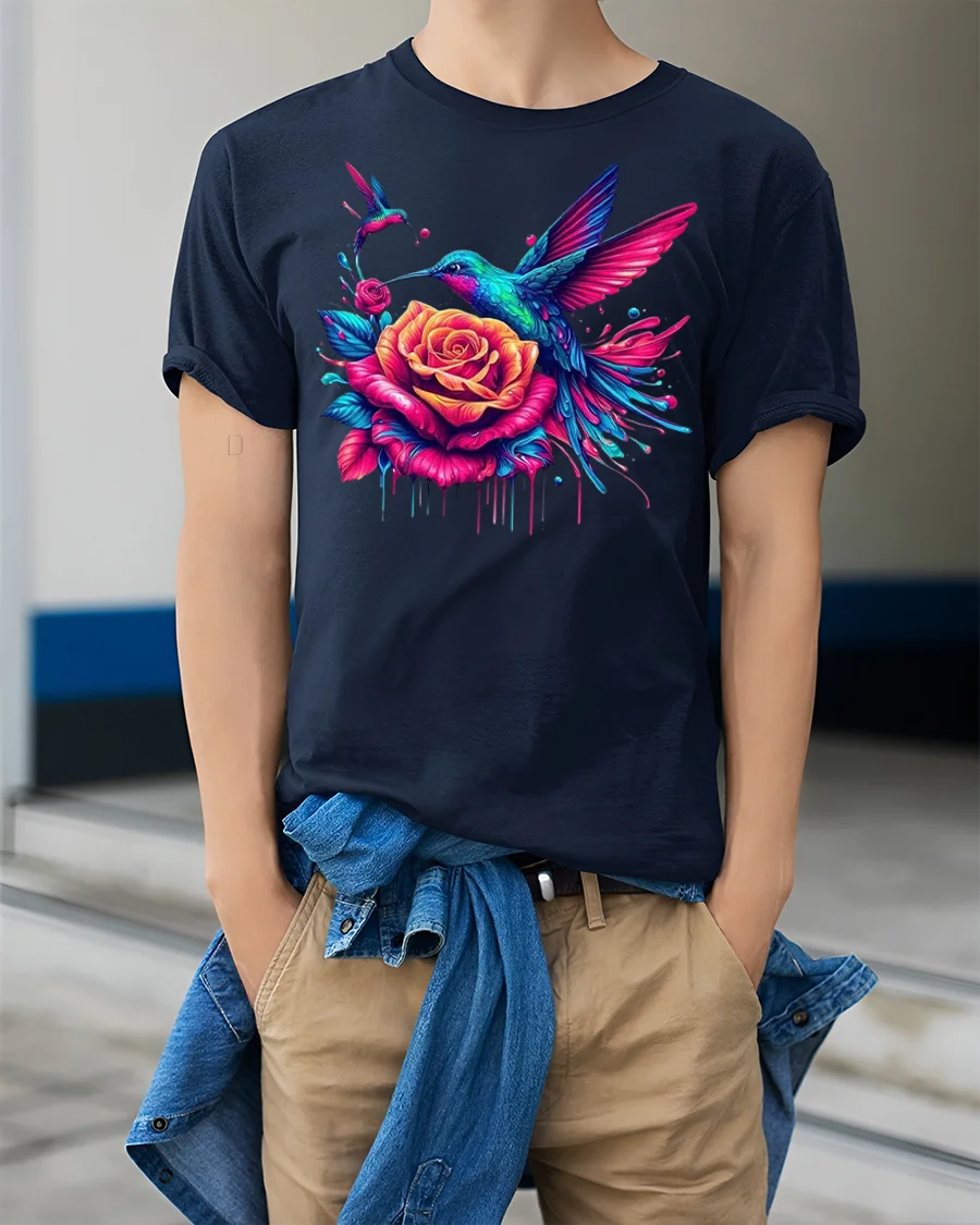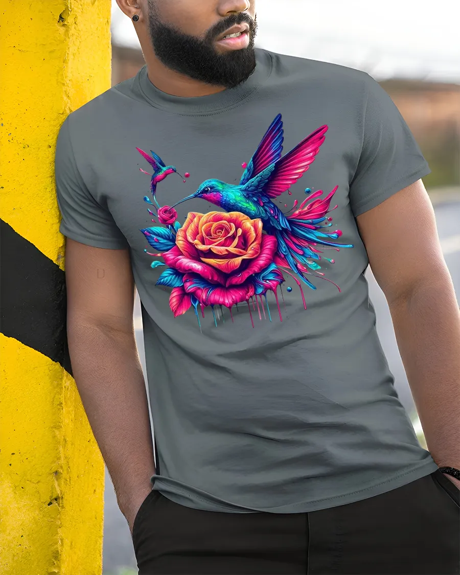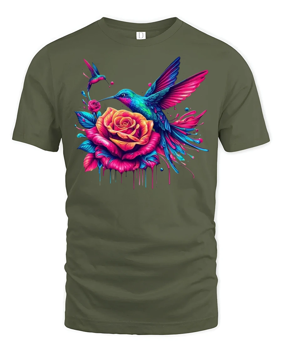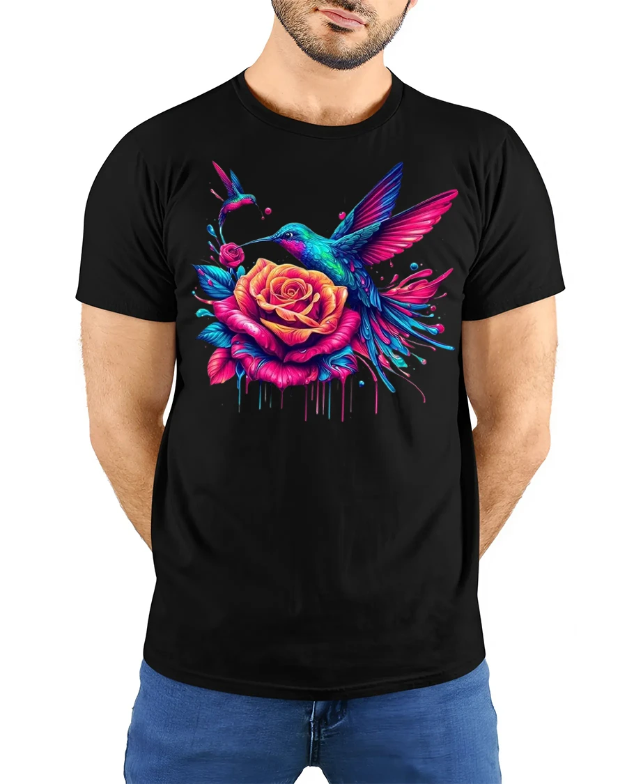 Vibrant Hummingbird and Rose Artwork Graphic T-Shirt is a stunning design that brings together the beauty of nature and artistic flair. Featuring a detailed hummingbird in mid-flight alongside a radiant rose in full bloom, this shirt bursts with color and energy. The dripping paint effect adds a modern twist, making it an eye-catching piece for anyone who loves unique and stylish fashion.