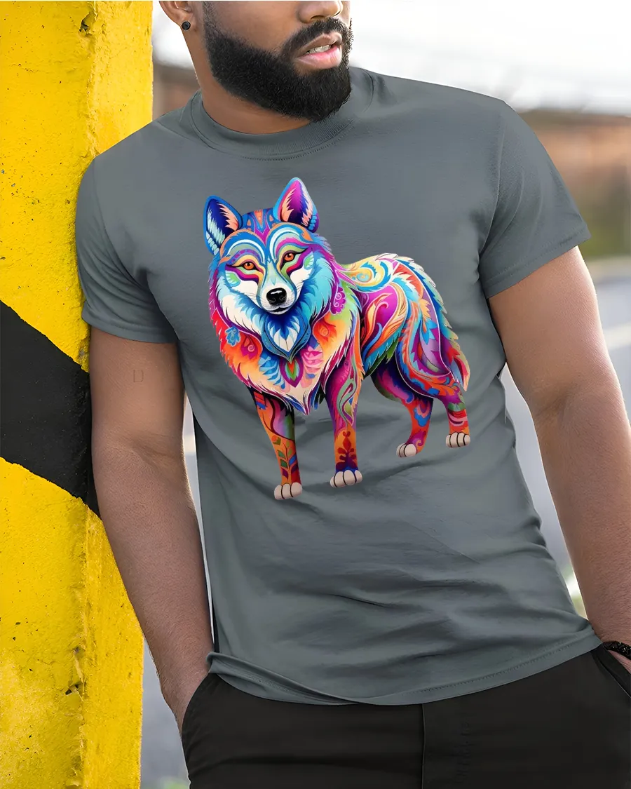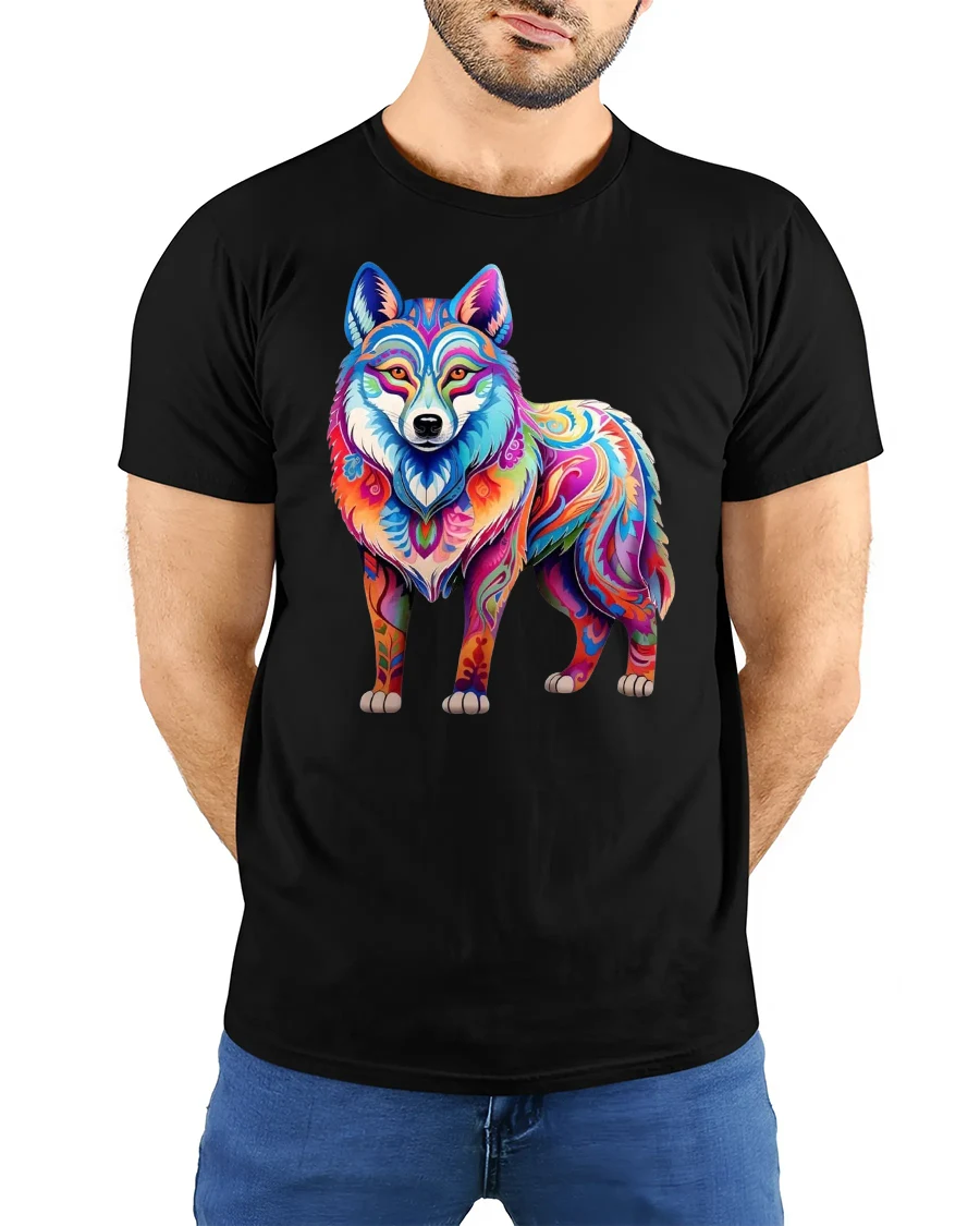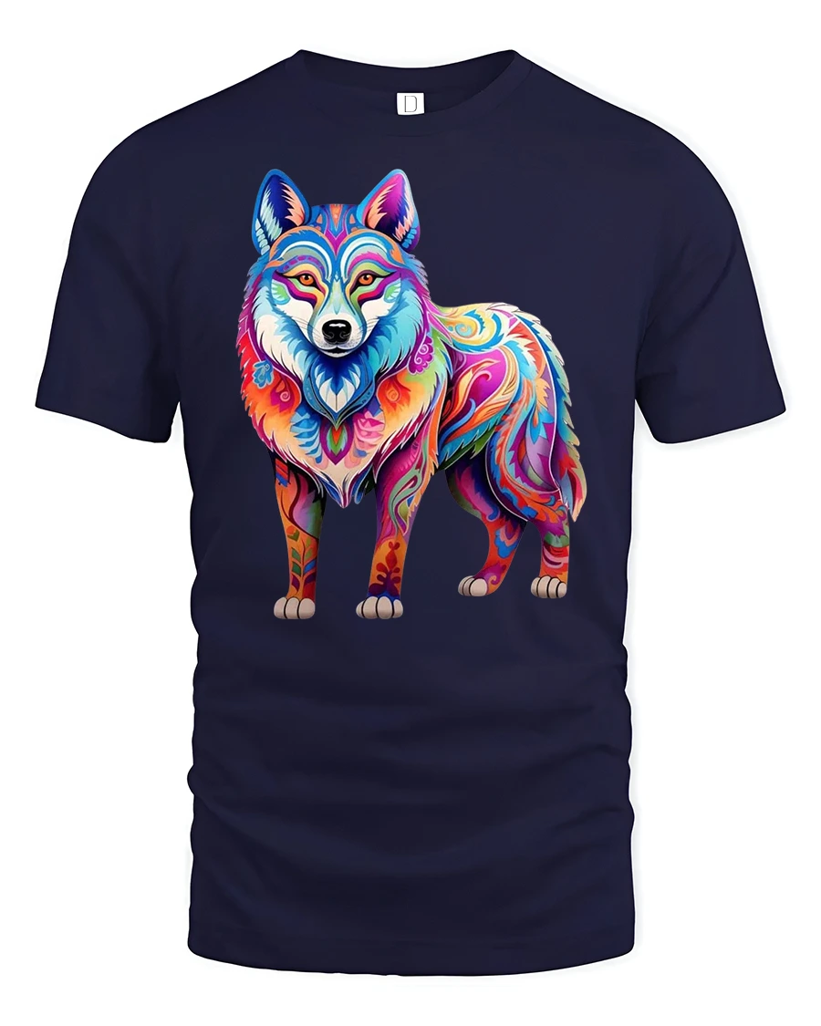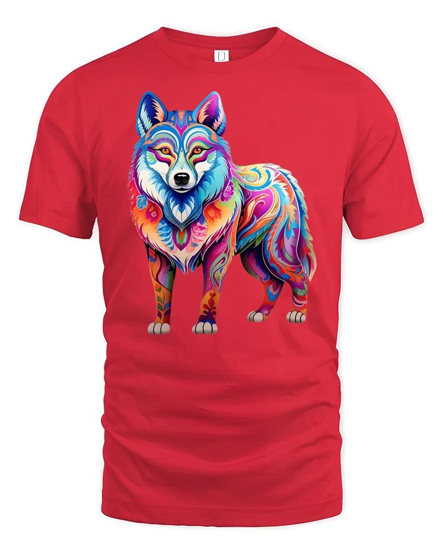 Made from soft and comfortable material, this t-shirt is perfect for everyday wear, festivals, art events, or any occasion where you want your style to speak loudly. The vibrant print stays bold and sharp, capturing the beauty of the wolf while adding a creative twist that feels fresh and modern. It makes an excellent gift for wolf lovers, artists, or anyone who enjoys colorful statement apparel.