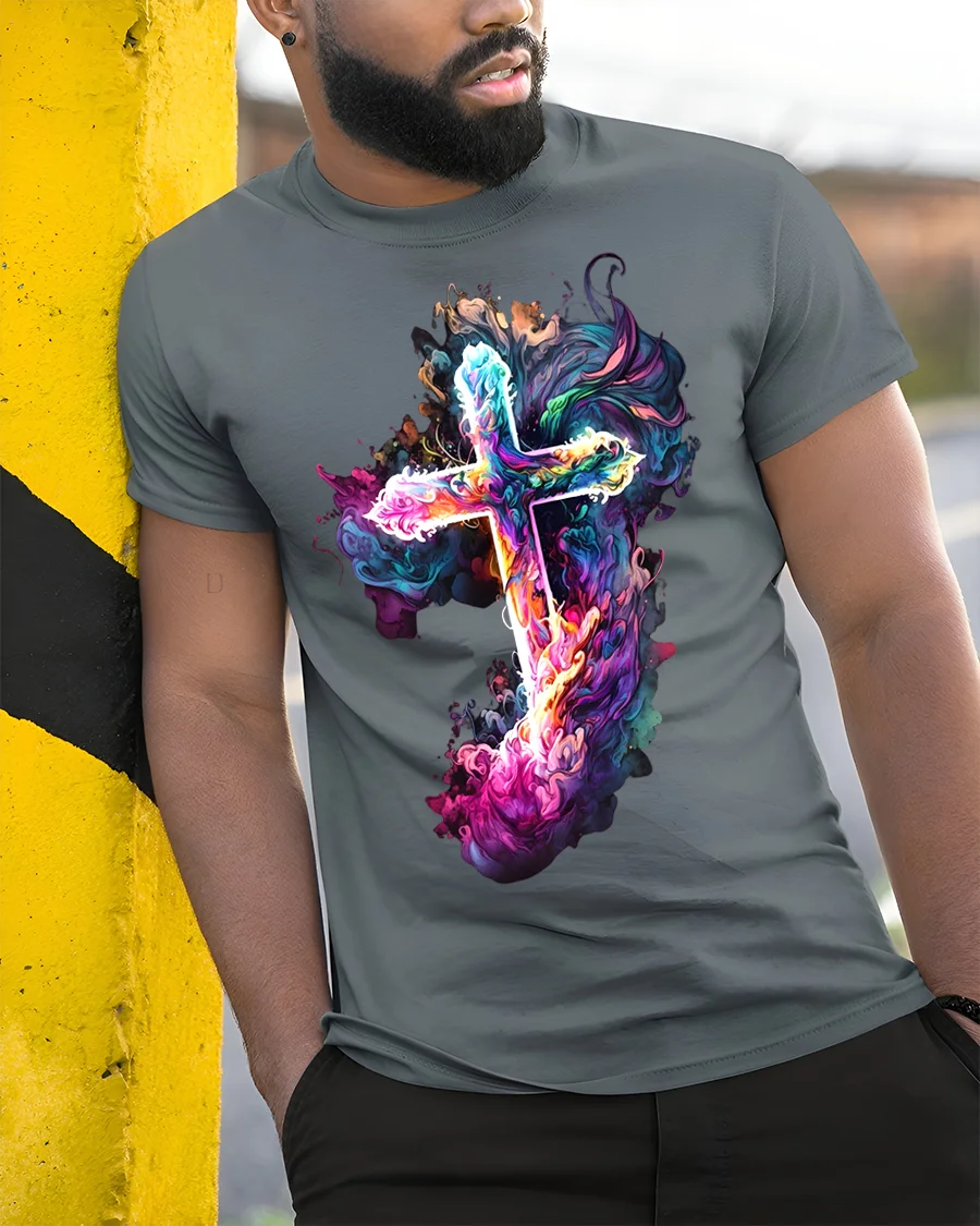 This striking tee features a bold cross design engulfed in a mesmerizing cloud of vibrant, flowing smoke and ethereal colors.