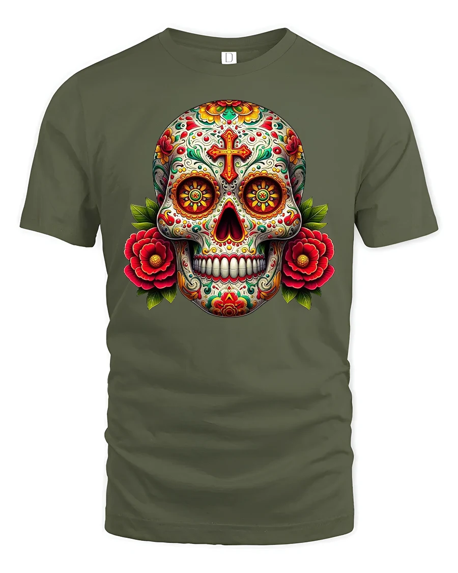 Vibrant Sugar Skull Floral Day of the Dead T-Shirt brings bold color and meaningful cultural artistry to your wardrobe. Featuring a beautifully detailed sugar skull surrounded by vivid red roses, this design celebrates tradition, remembrance, and the beauty of Dia de los Muertos with stunning craftsmanship.