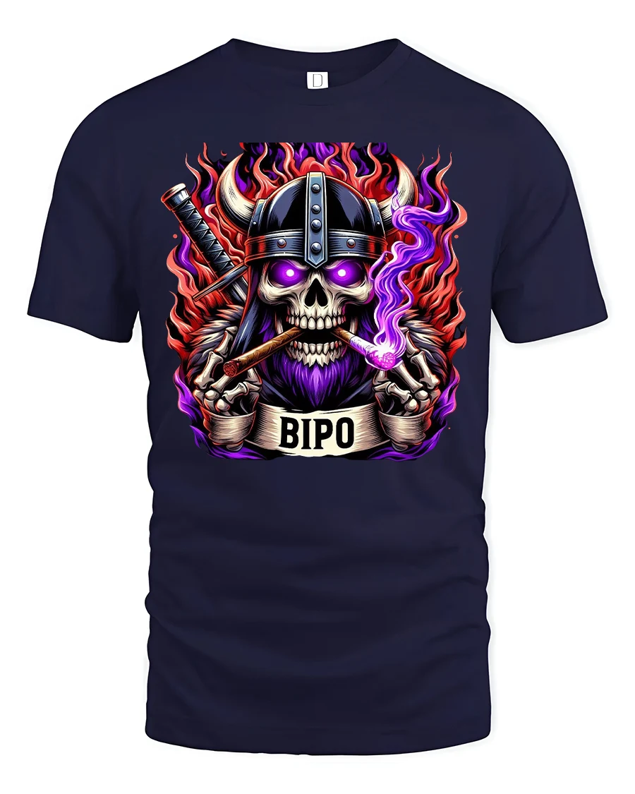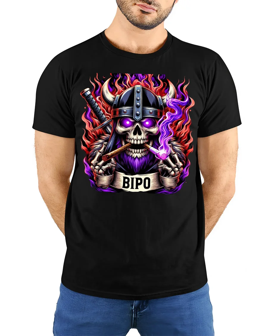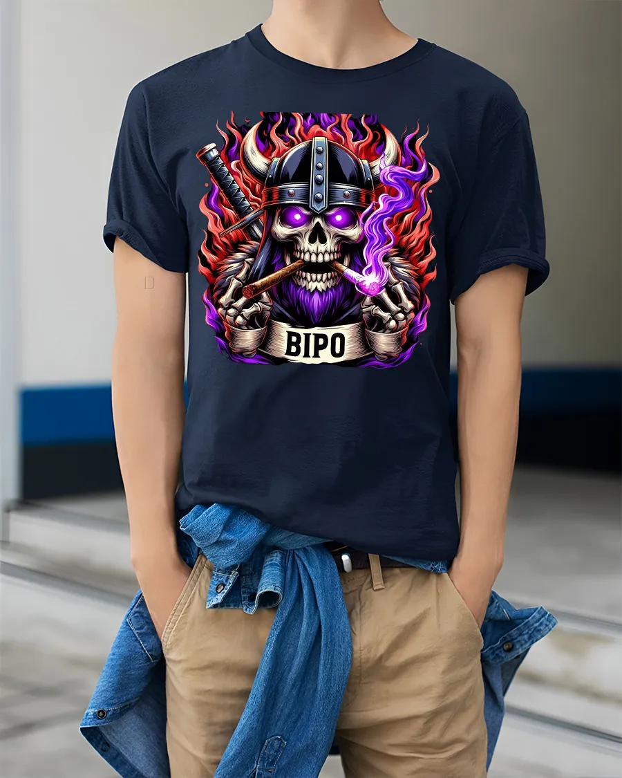 Viking Skull Warrior with Flames Graphic T-Shirt is the perfect choice for those who love bold gothic fashion, fantasy artwork, and Viking-inspired designs. The shirt features a fearsome skull wearing a Viking helmet, glowing purple eyes, and fiery flames surrounding the figure. With swords and cigars adding extra attitude, this artwork delivers power, rebellion, and a touch of dark humor all in one.