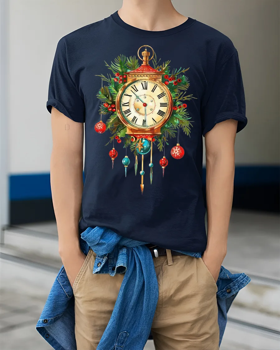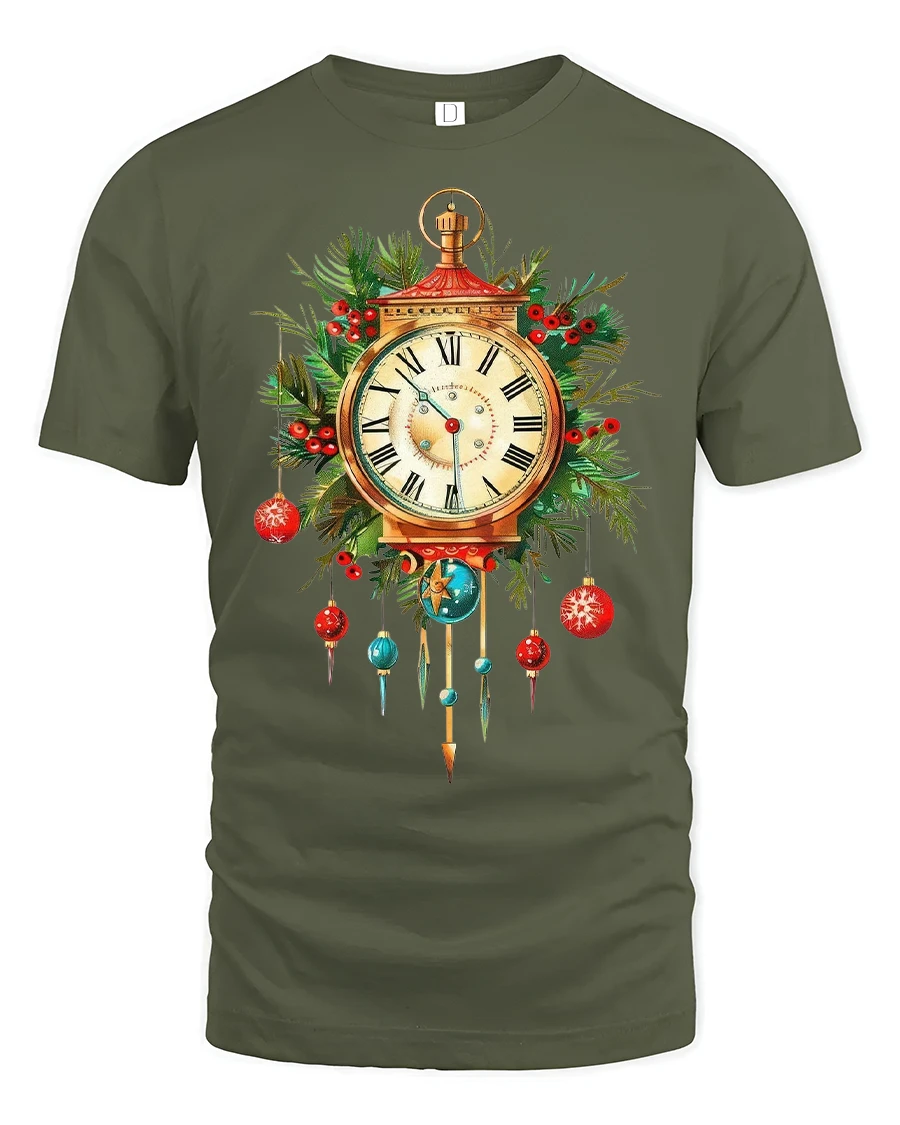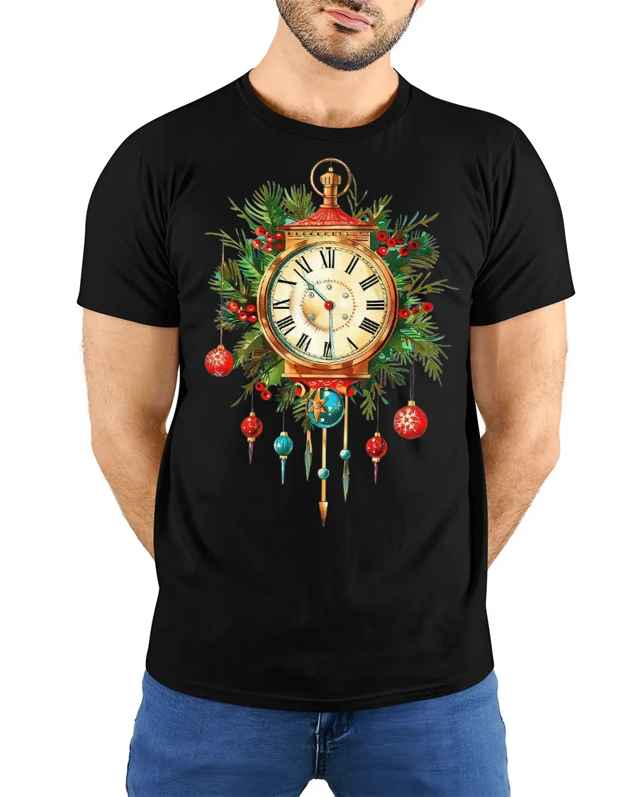 Celebrate timeless holiday charm with this christmas clock t shirt featuring a beautifully detailed vintage clock surrounded by festive greenery and hanging ornaments.