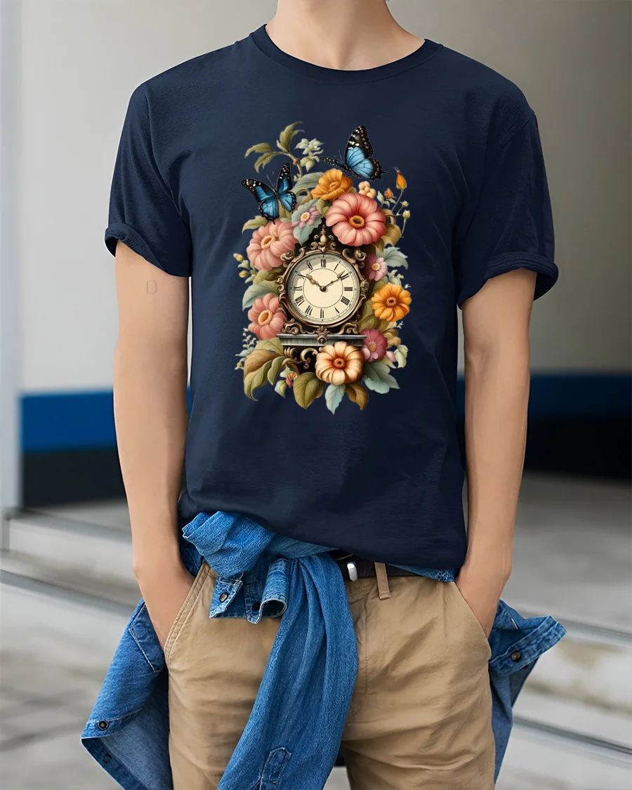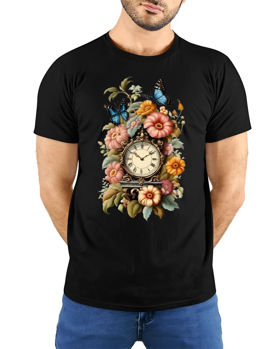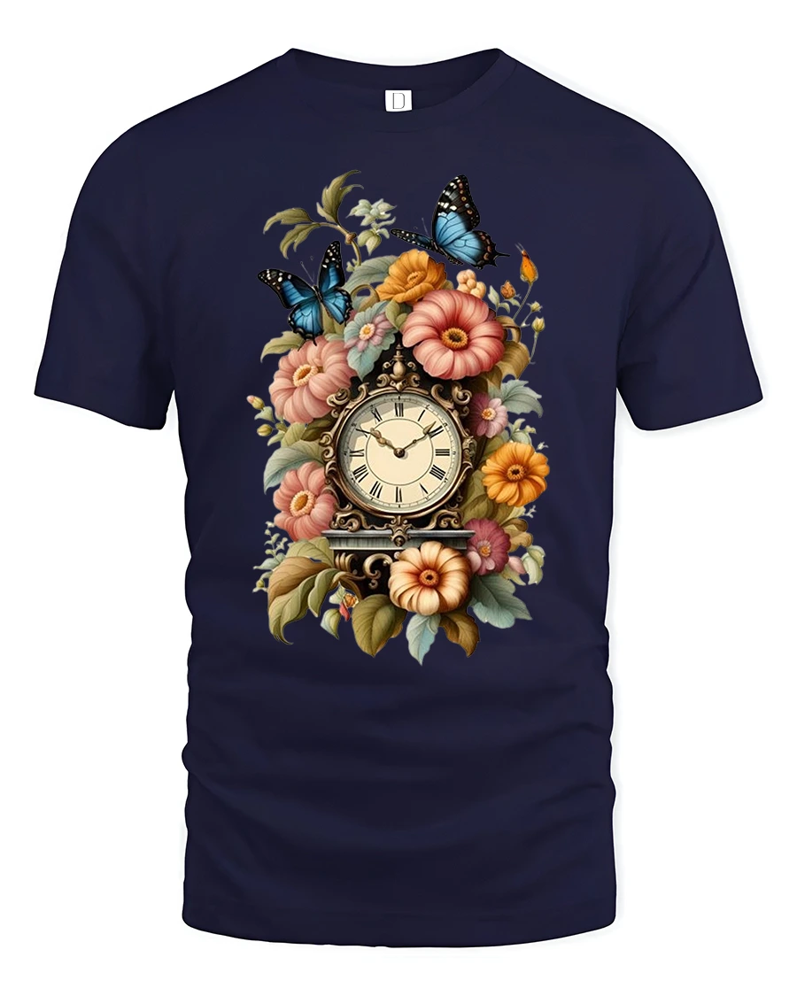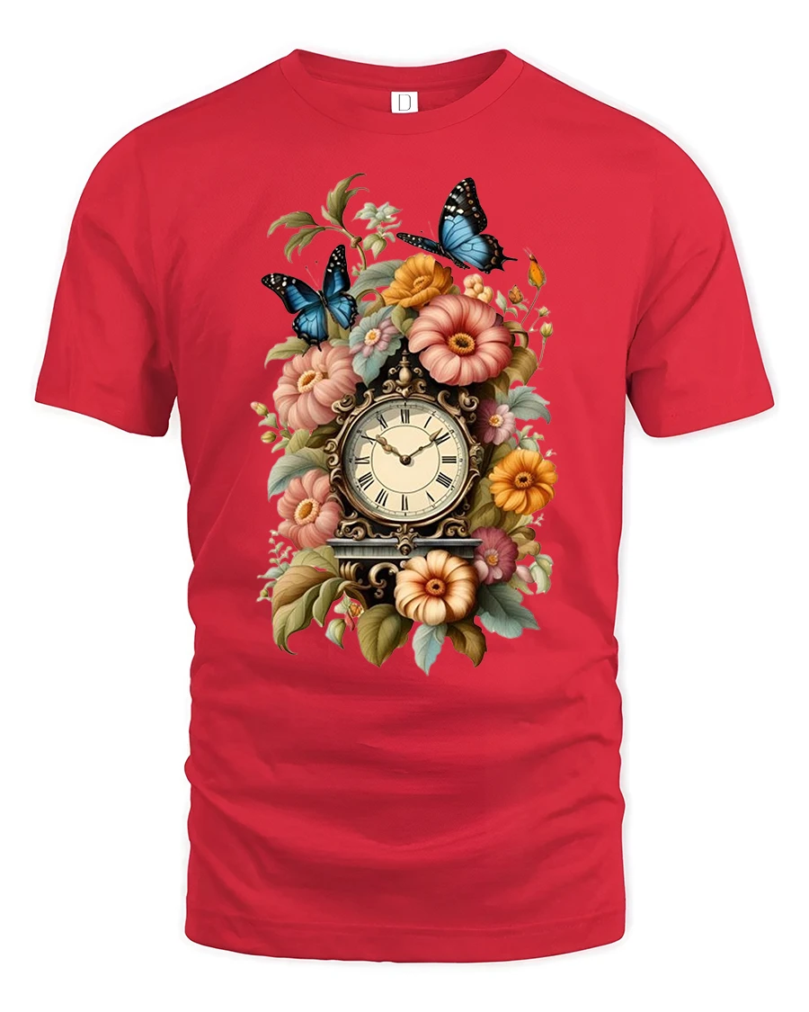 Vintage Floral Clock Butterfly Art Tee with Elegant Style brings together timeless beauty and artistic detail in a design that feels both classic and enchanting. The centerpiece clock is surrounded by richly colored flowers and graceful butterflies, creating a wearable artwork that stands out in any casual or stylish outfit. This tee offers a soft and comfortable feel, making it ideal for everyday wear while still looking effortlessly elegant.