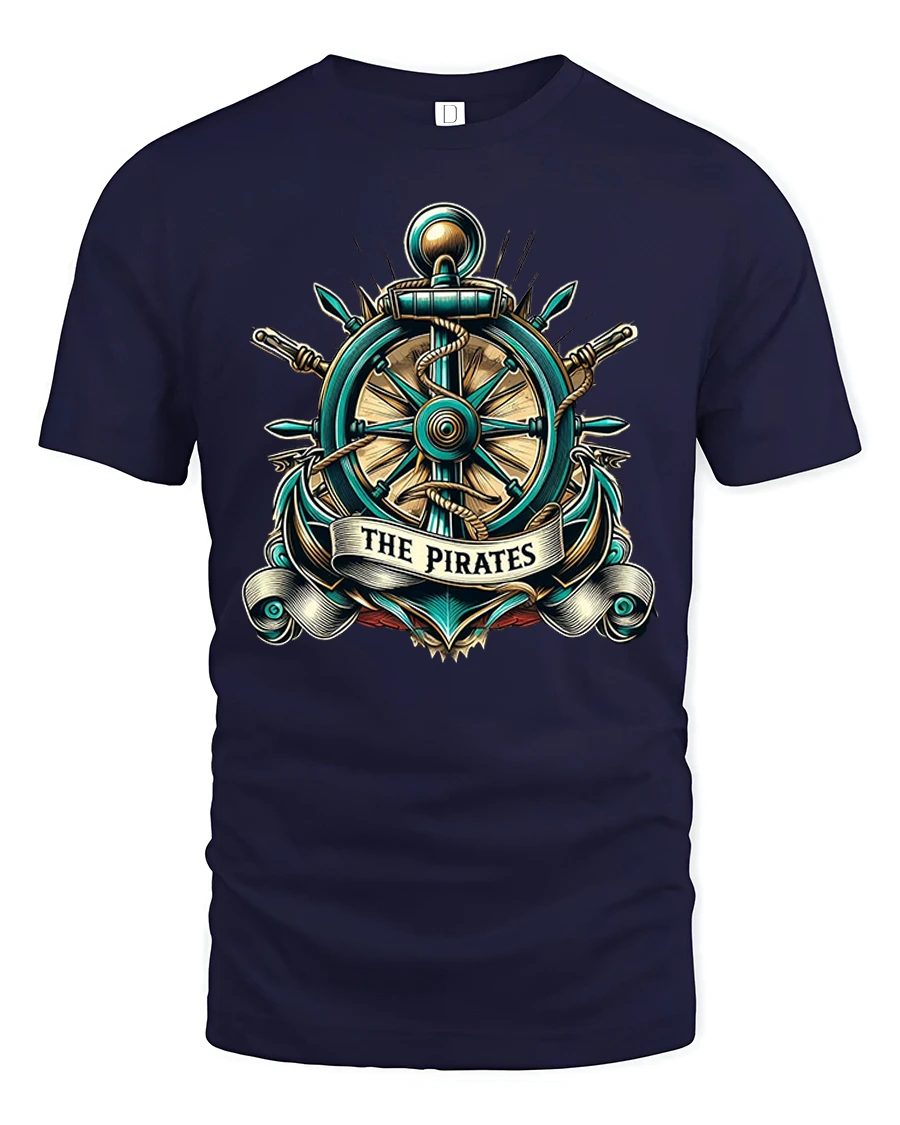 This pirate t shirt features a detailed ship wheel combined with a strong anchor creating a powerful maritime emblem.