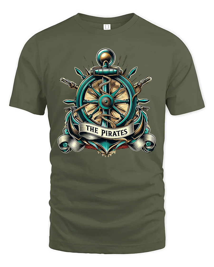 The Vintage Pirate Ship Wheel Anchor Emblem Nautical Graphic T Shirt delivers a bold ocean inspired statement rooted in classic pirate style.