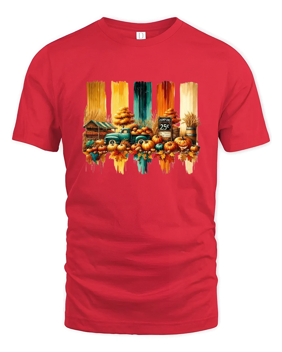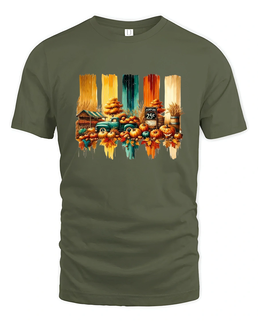 Featuring a nostalgic green truck surrounded by pumpkins, fall leaves, and rustic farm scenery, this tee captures the cozy charm of the harvest season.