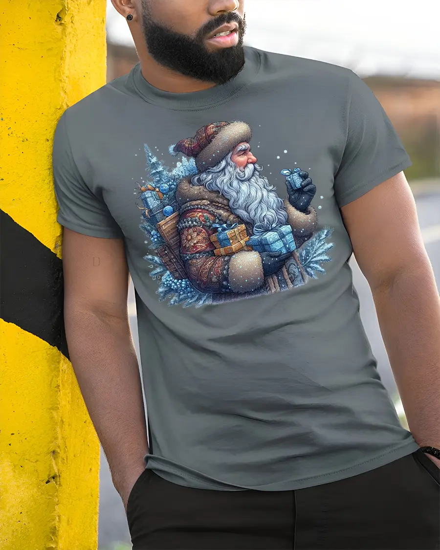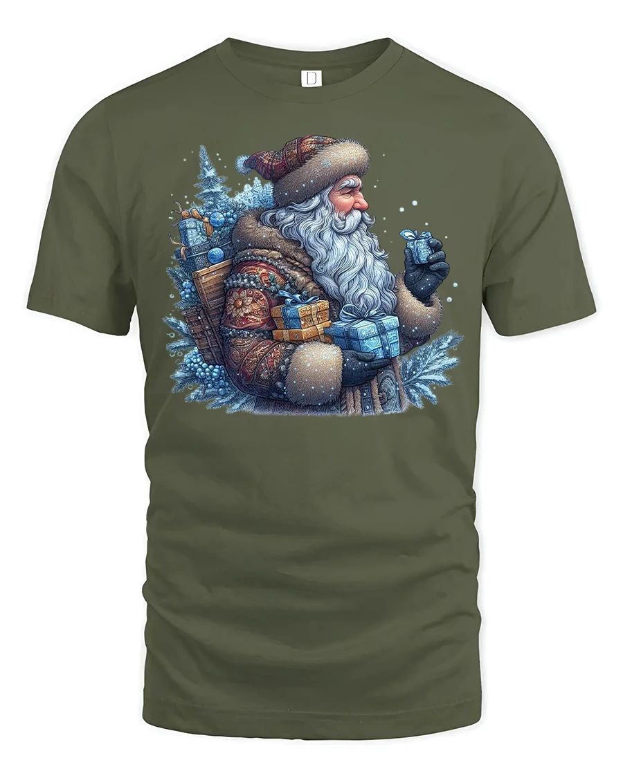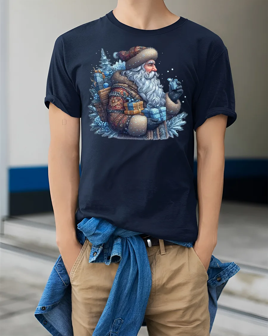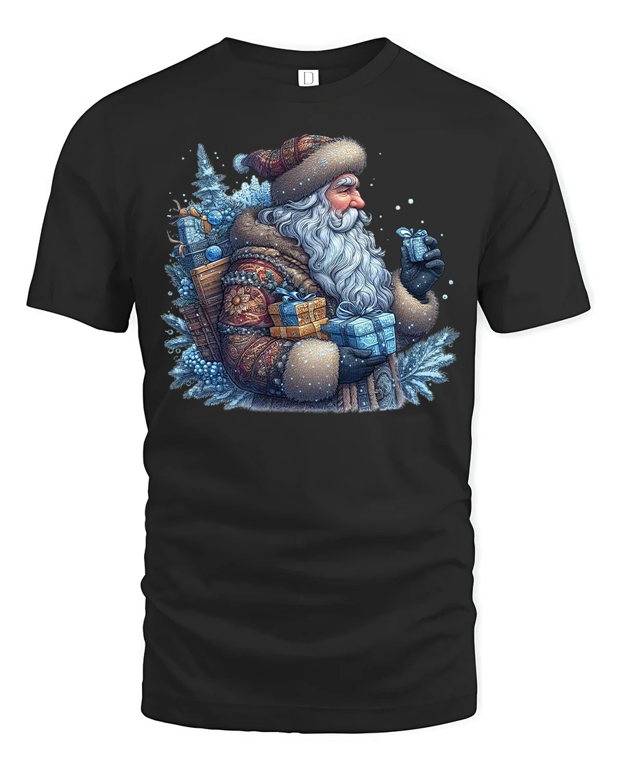Vintage Winter Santa Gifts Frosty Christmas Graphic Tee brings cozy holiday charm and traditional Christmas spirit to your seasonal wardrobe. Featuring an old-world Santa bundled in warm winter clothing, carrying beautifully wrapped gifts through a snowy forest, this design captures the nostalgic magic of a classic Christmas. The cool blue tones, frosty textures, and detailed artwork create a heartwarming winter scene that stands out beautifully.