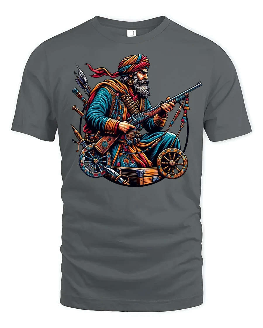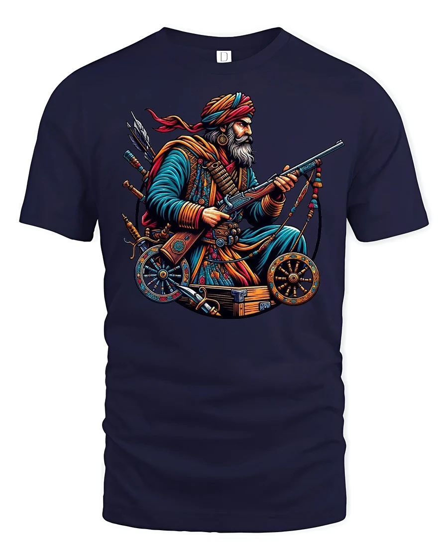 Warrior Fighter Vintage Rifle Hero Battle Graphic Tee is a striking design that captures the spirit of bravery, tradition, and strength. Featuring a detailed warrior holding a rifle and surrounded by historic weaponry, this shirt symbolizes courage and the timeless legacy of fighters who stood tall in battle. The vivid artwork brings together bold colors and intricate detailing, making it a unique fashion statement for history lovers and fans of warrior art.